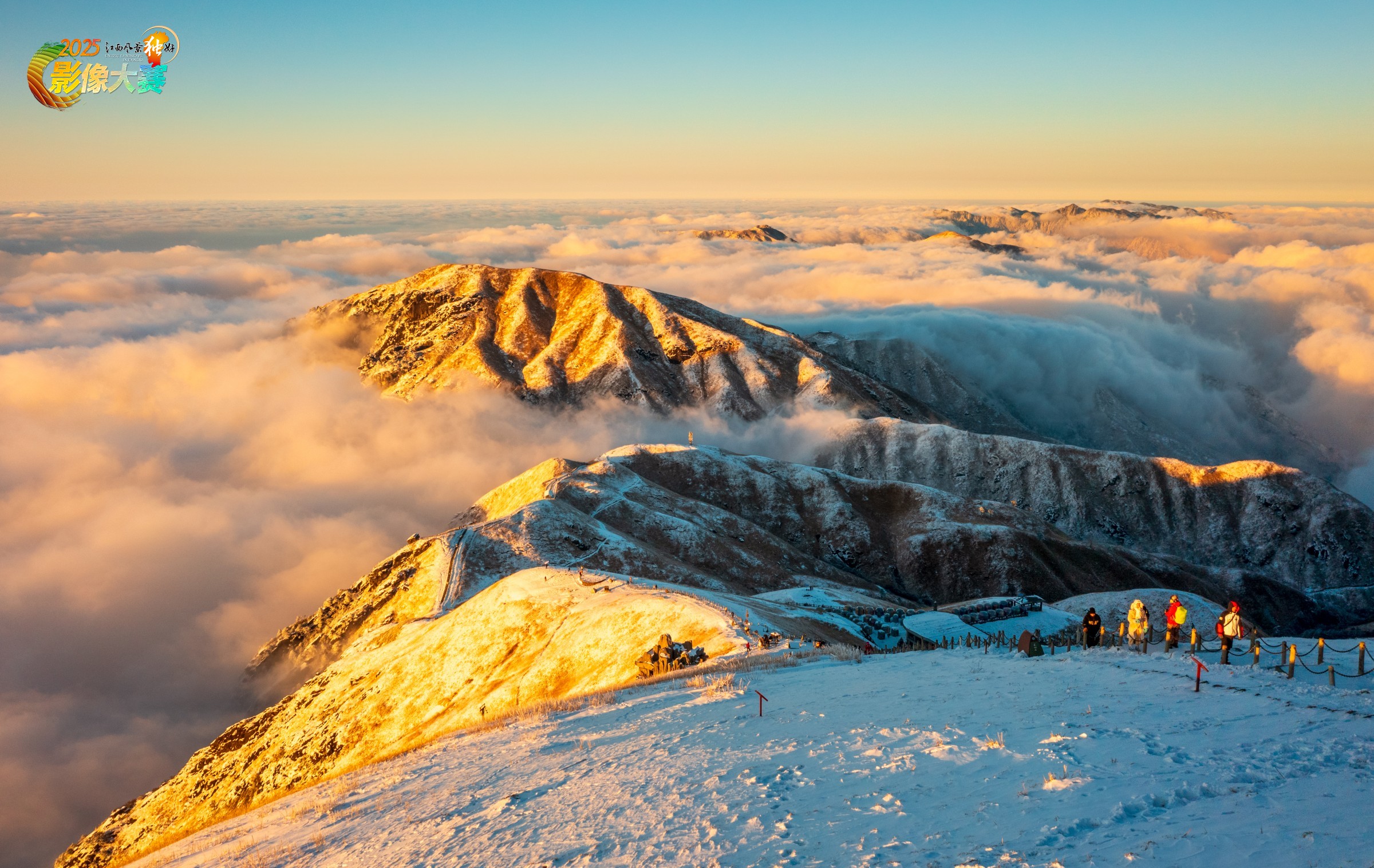 2024年1月23日,雪后晴空,阳光洒在峰峦上呈现一片金黄,游人不畏寒冷踏雪登山,好一幅自然之美与心灵感悟的交融。
