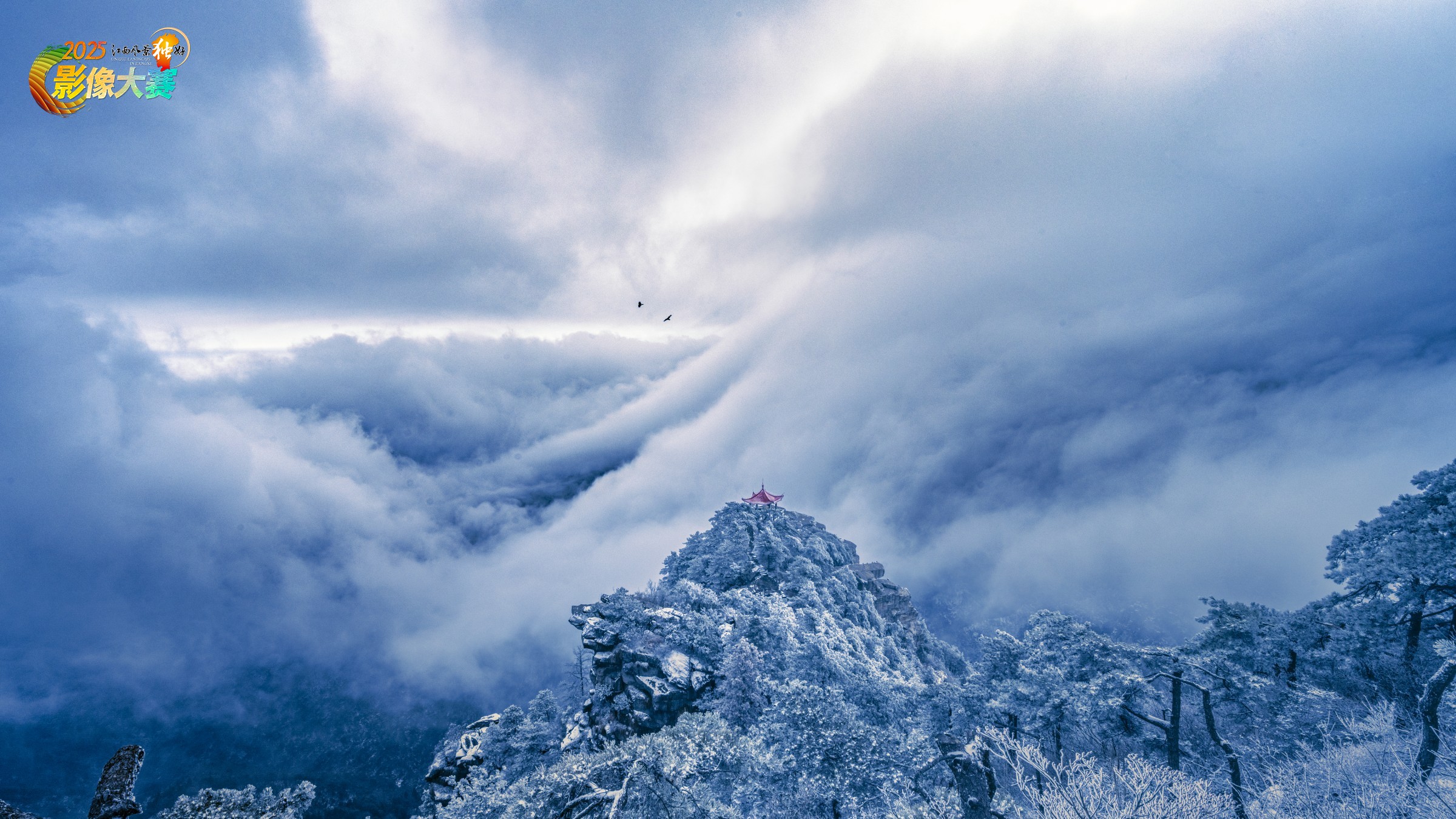 作品拍摄于庐山观云亭,满目素色,云瀑翻腾,观云亭红色亭顶装点期间,高天寒流,二只小鸟在云涛之上自由飞翔。