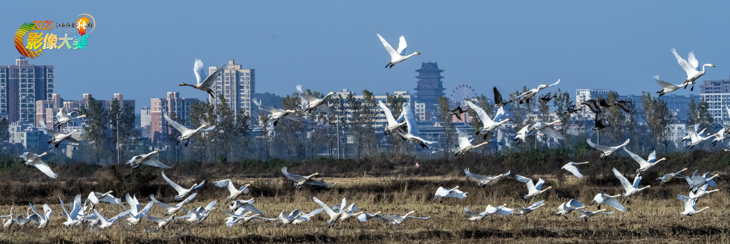 《生态鄱阳》图片说明:每年冬季,越冬候鸟飞跃万里来鄱阳湖越冬,当地政府出台爱鸟护鸟一系列措施,保护候鸟。由于生态环境好和爱鸟护鸟意识强,越来越多的候鸟来鄱阳越冬,图为鄱阳县城角丰圩天鹅觅食飞翔的美好瞬间,前景为稻田觅食后起飞的天鹅,背景为鄱阳县城和县城标志性建筑鄱阳楼。