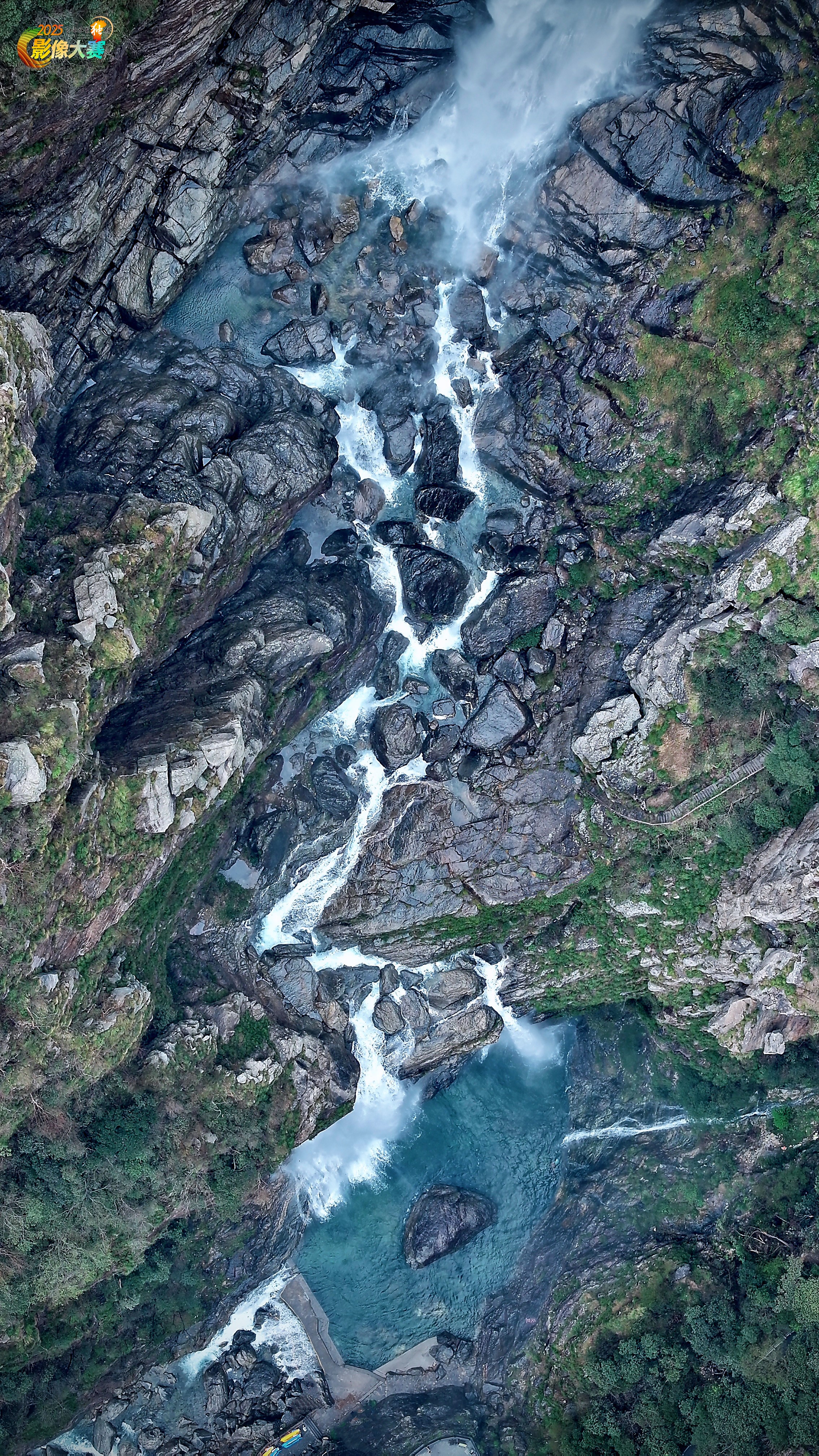 这是庐山三叠泉的航拍视角——从瀑布正上方俯瞰,湍急水流如银练穿梭于青黑岩谷间,碧潭与飞瀑在方寸间织就动静交织的韵律。虽未直白展现“三叠”的垂直落差,却以“上帝视角”解锁了瀑布藏于深谷的肌理:冷石裹翠、激流碎玉,将雄奇山水凝作一帧凝练的“流动的画”。