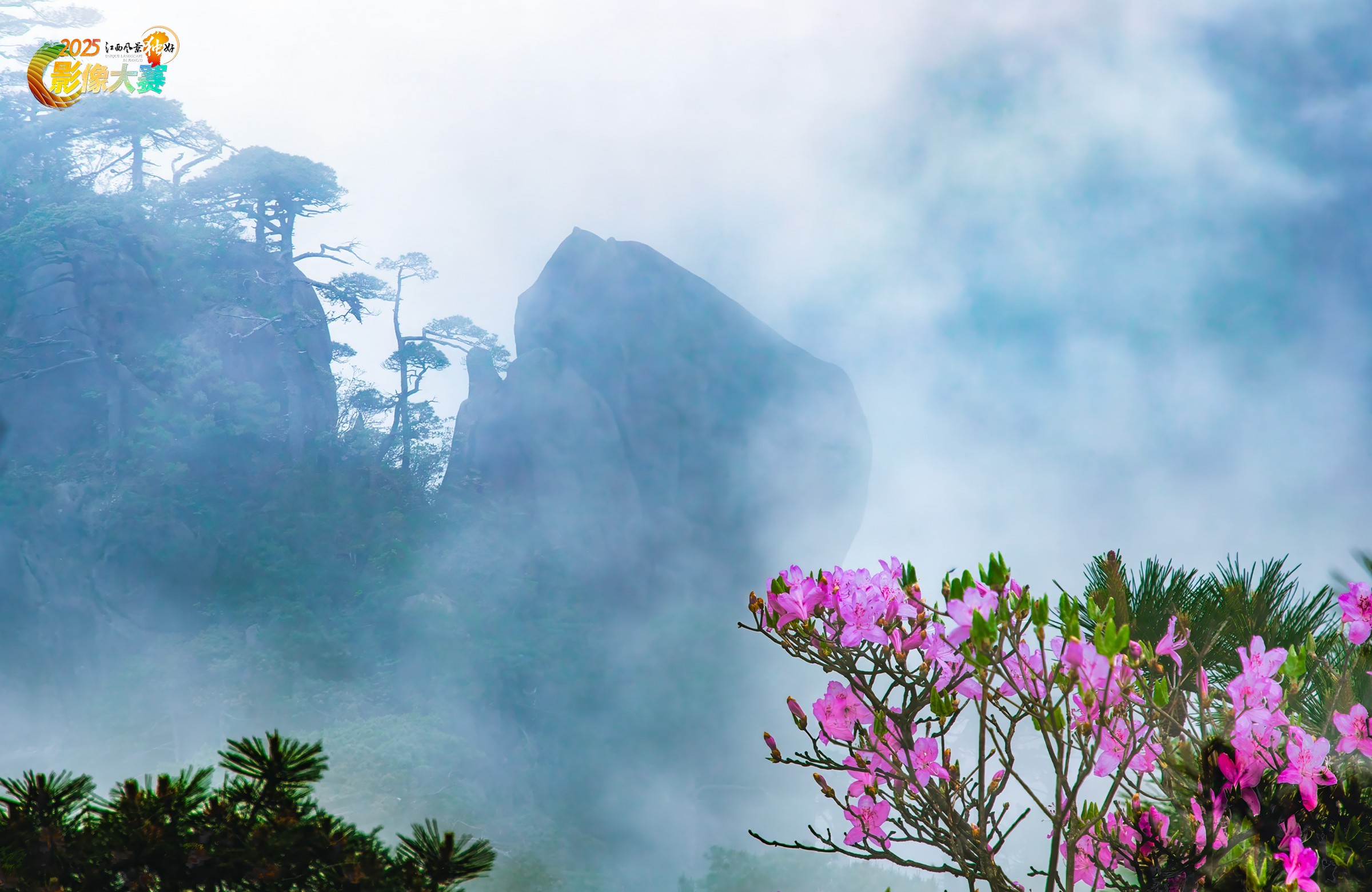 三清山玉女开怀景点:盛开的高山杜鹃与云雾的加持,展现了春情与羞涩的交织。