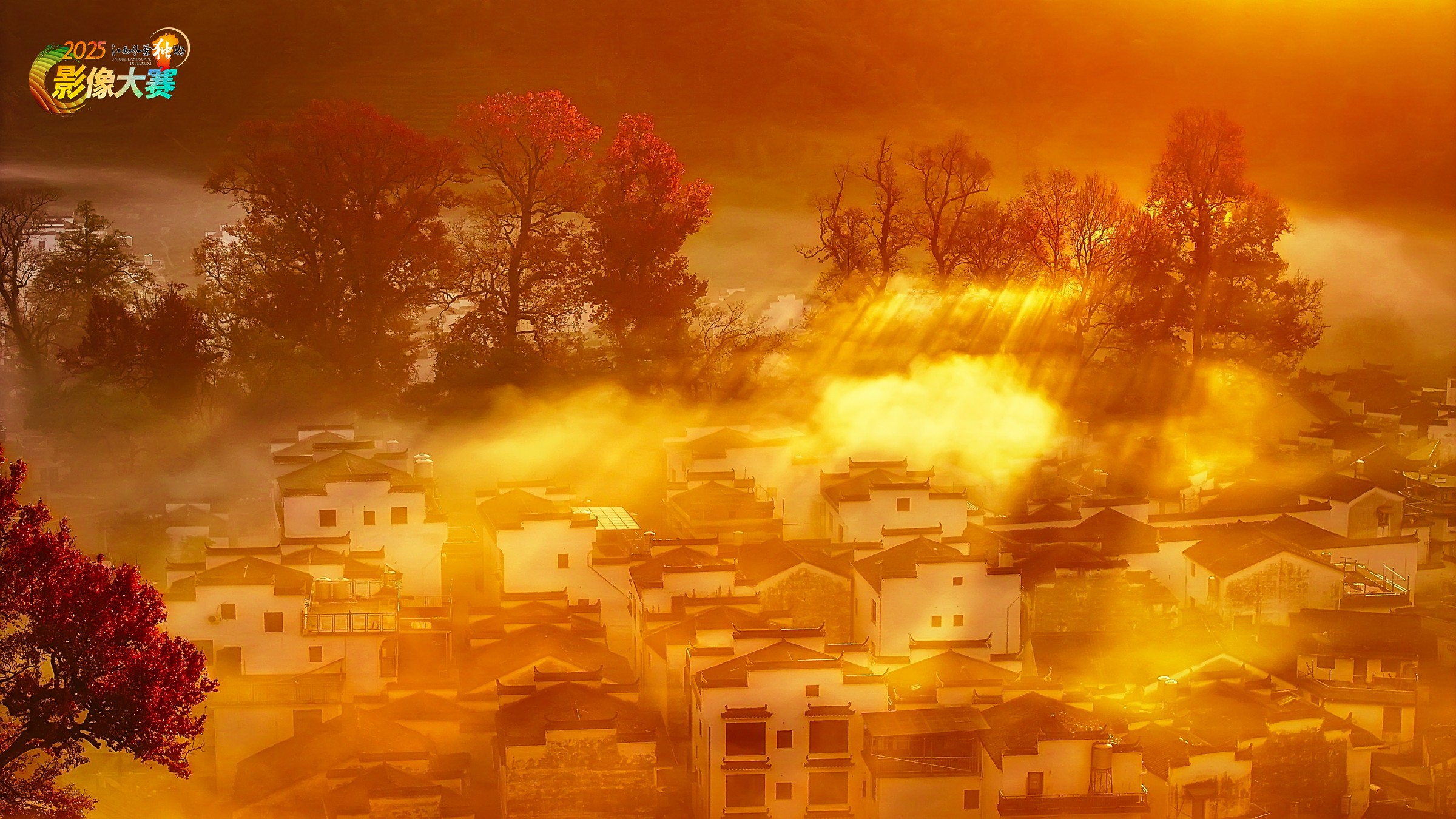 阳光穿透雾霭,洒下万道金辉,给整个村落镀上一层暖黄的光晕。红枫在雾中若隐若现,徽派建筑的轮廓在光影里时明时暗,仿佛是天地间最温柔的笔触,将江南的灵秀与秋的绚烂,都凝在了这一方山水村落之间。每一缕风过,红叶簌簌,雾气悠悠,便是石城的诗意。