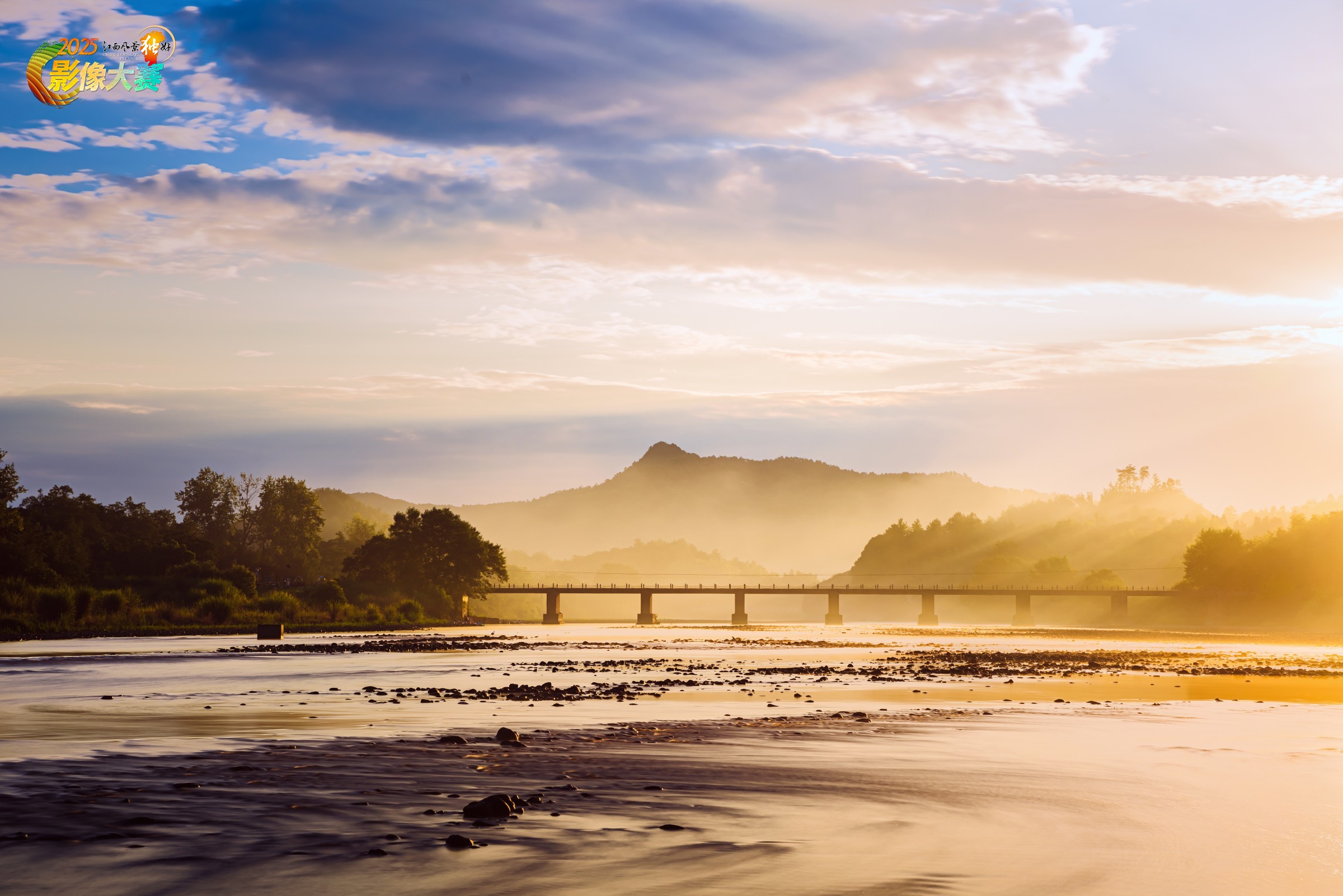 画面展现了清晨时分的山水河景,阳光为天空、河流、山峦镀上暖金色,云雾轻柔笼罩远山,桥梁横跨河面,整体氛围静谧悠远,充满自然的诗意与时光的温柔感。2025年8月18日拍摄于江西省鹰潭市龙虎山上清
