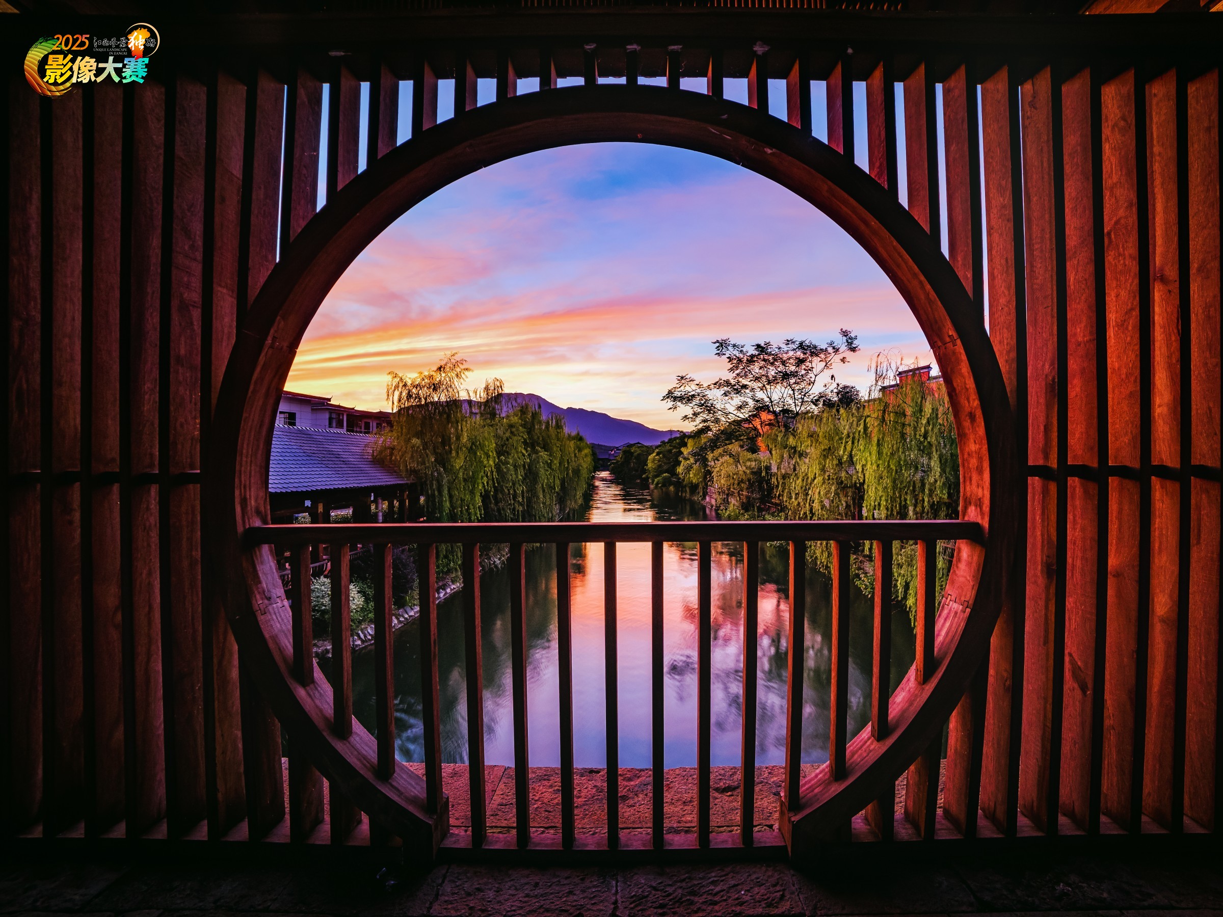 画面以中式圆形木窗为框,将朝霞中的河流、绿树、远山与建筑纳入其中,木窗的古朴与朝霞的绚丽形成对比,整体如一幅天然的“框景画”,传递出古典雅致与自然诗意交融的氛围。2024年7月9日拍摄于江西省鹰潭市上清镇
