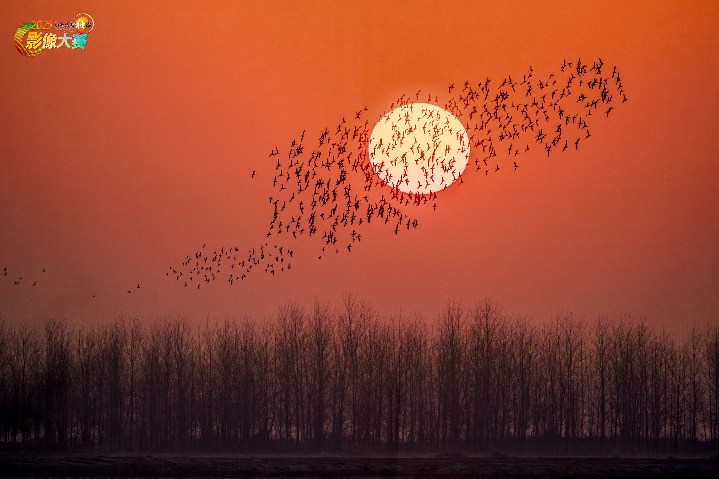2024年12月29日拍摄于鄱阳湖沙湖山水域。暮空浸成赤橙,圆阳悬在天际,群鸟振翅织就碎影,黑羽与金阳撞出美妙时刻。