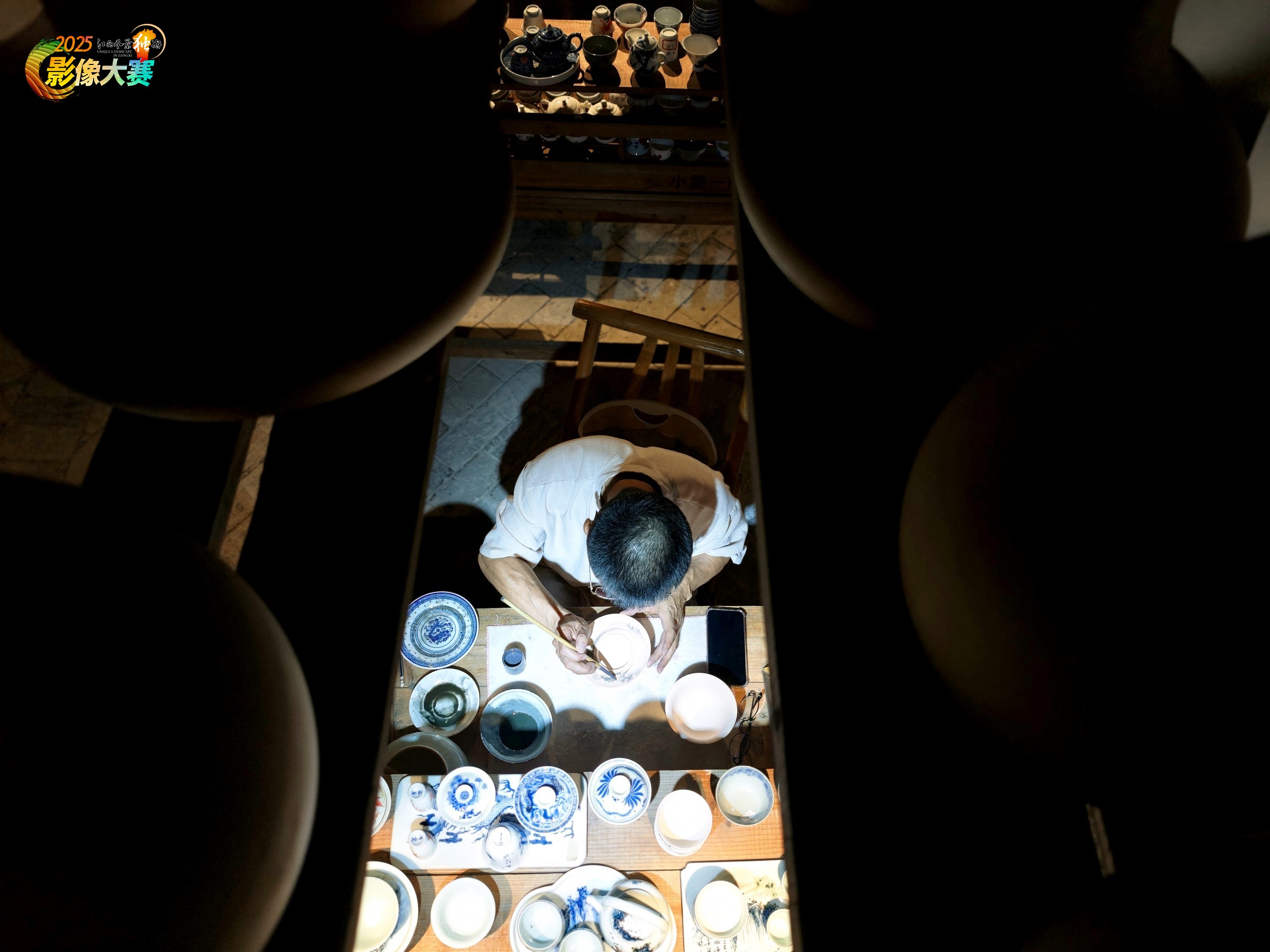 在陶瓷制作工坊,从摆放瓷胚的格栅向下看,一位工匠正聚精会神地绘制陶瓷精美的图案。