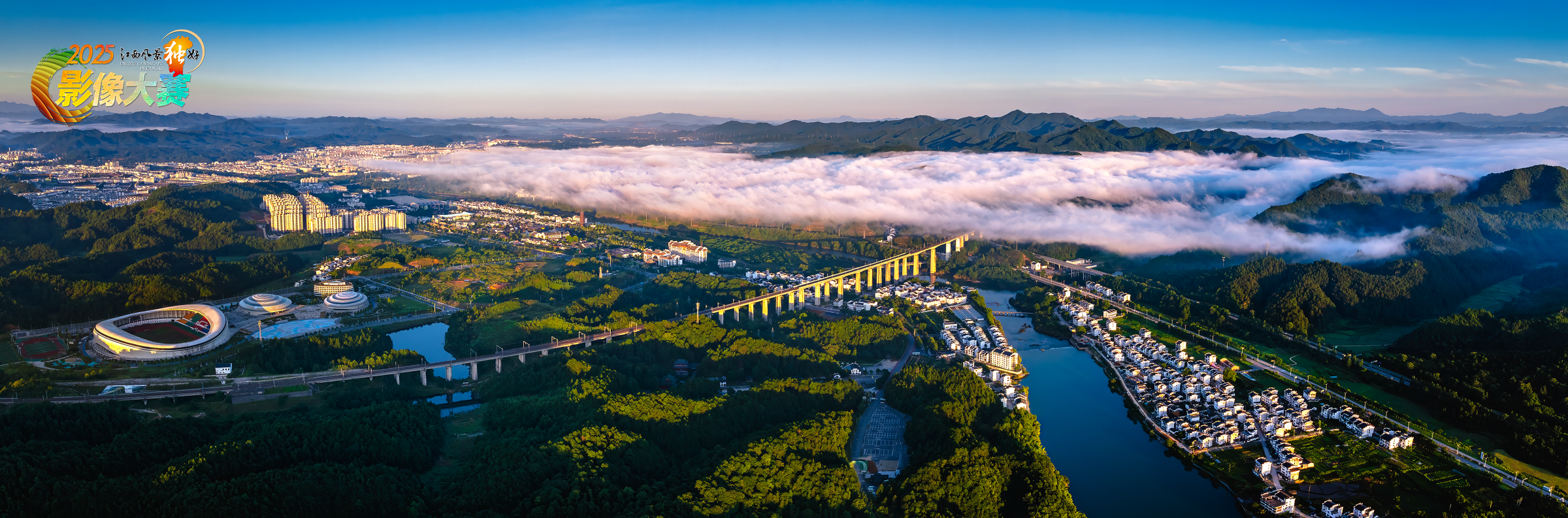 古民居、现代场馆与高楼大厦、高速铁路、山川河流及奔腾的云海既连通古今,又预示未来。