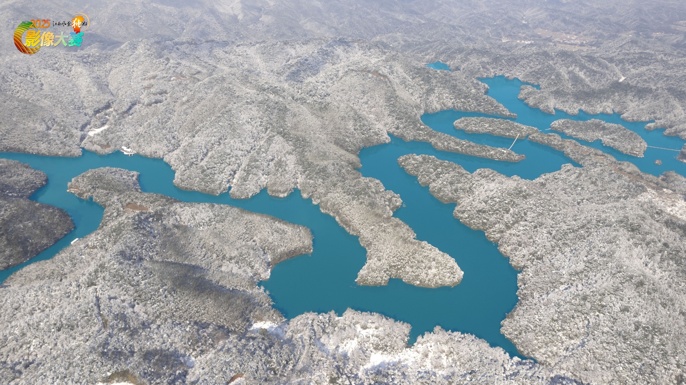 江西省抚州市资溪县九龙湖国家级湿地公园,空中俯视宛如蛟龙盘卧于山峦丛林之间,雪后的森林与清澈的湖水勾画成了大地调色板。