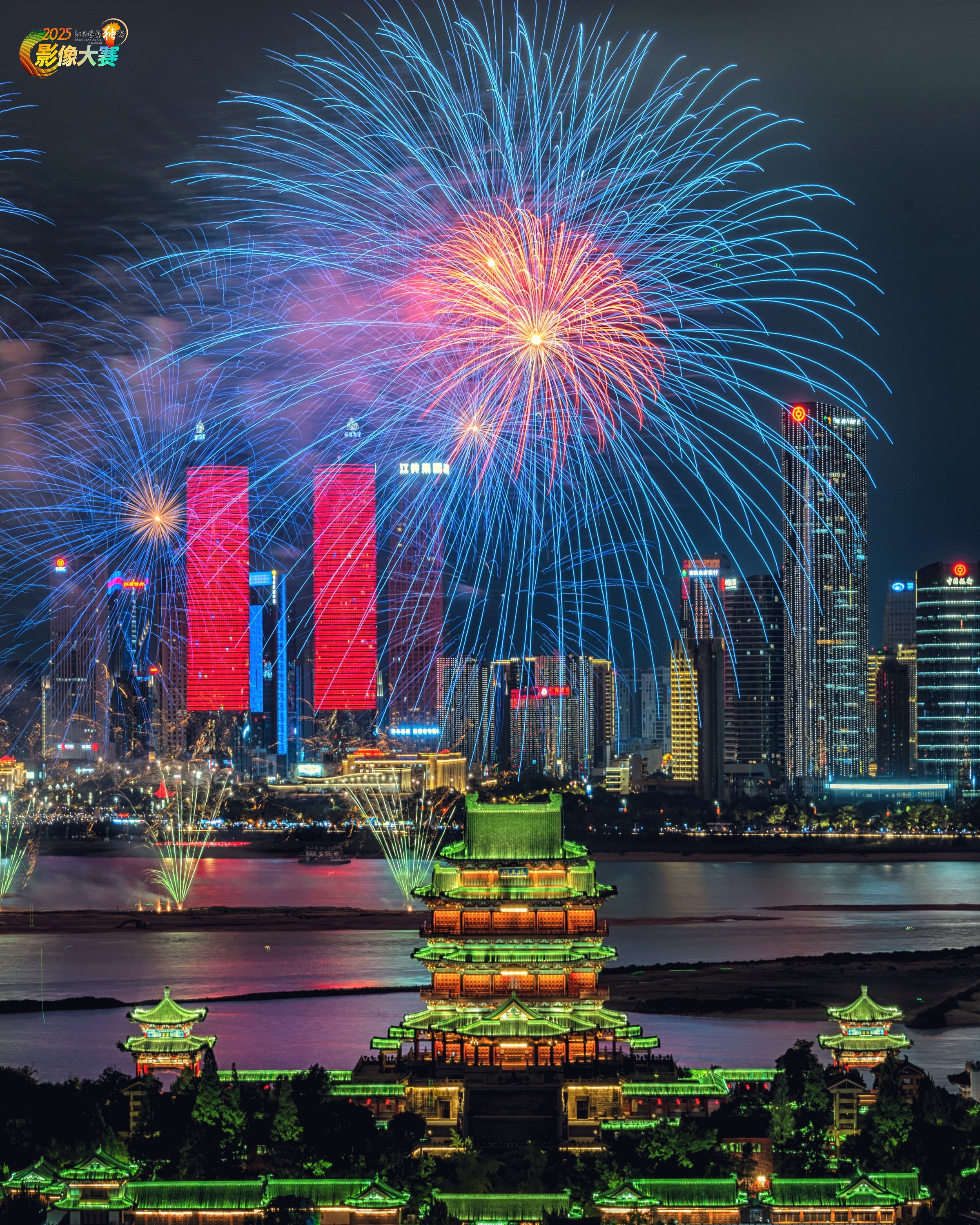 尼康D850,镜头80-400mm焦距80mm,iso50,光圈11,速度4秒。2023年10月1日南昌市庆国庆焰火晚会,南昌市拍摄。
