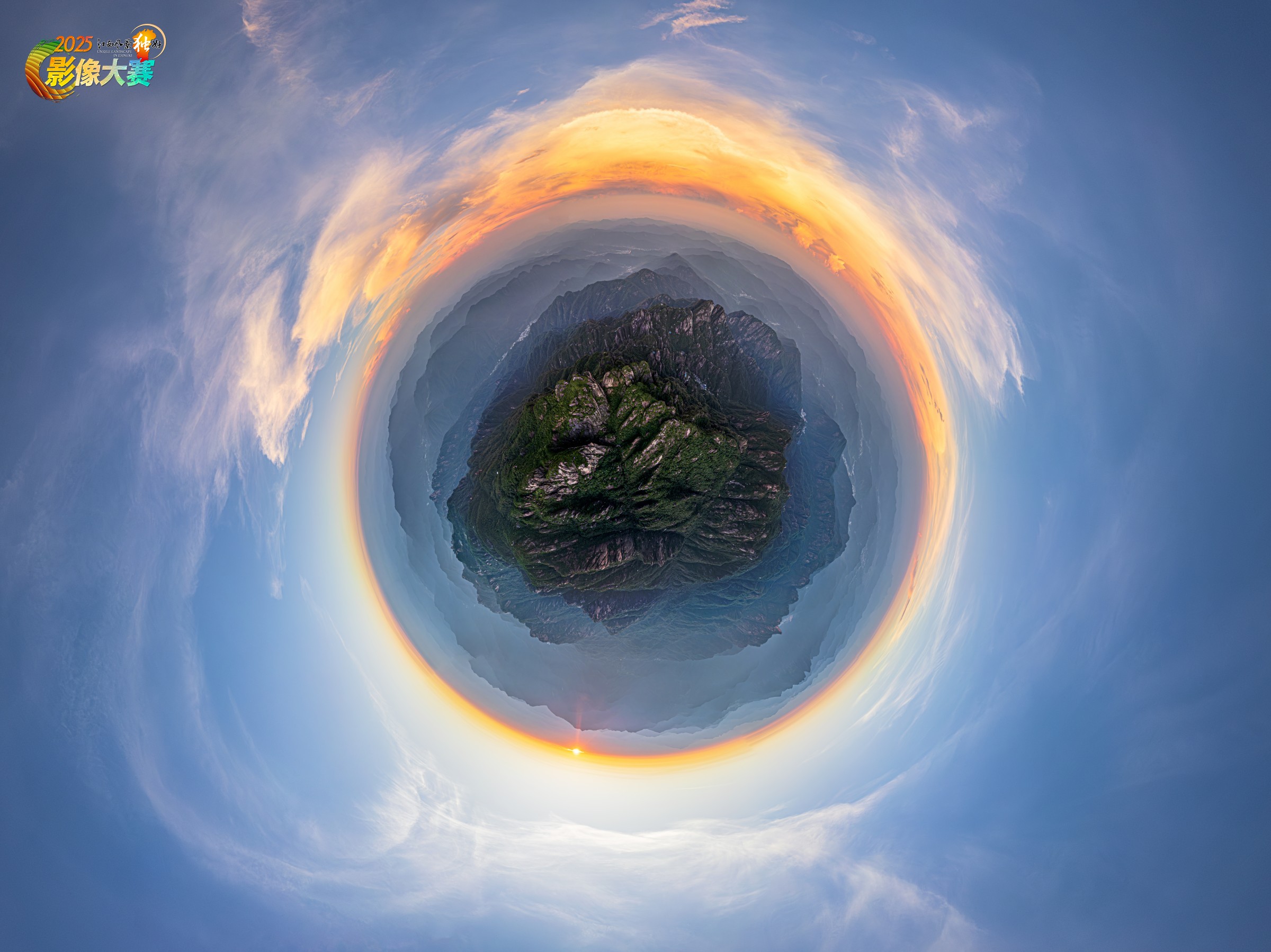 拍摄于江西上饶三清山西海岸,无人机起飞使用全景模式拍摄。天空出现罕见的蘑菇形状的火烧云