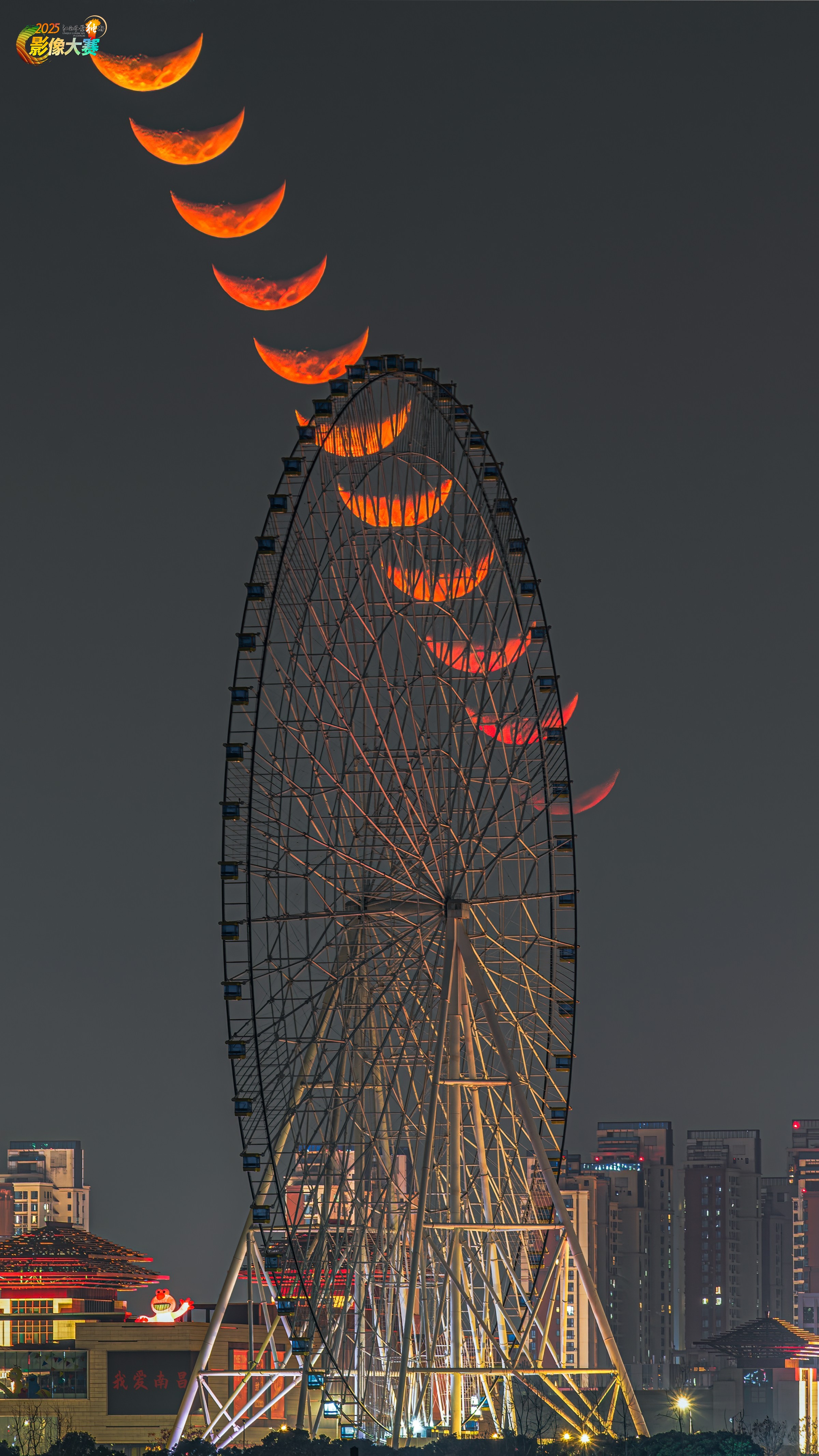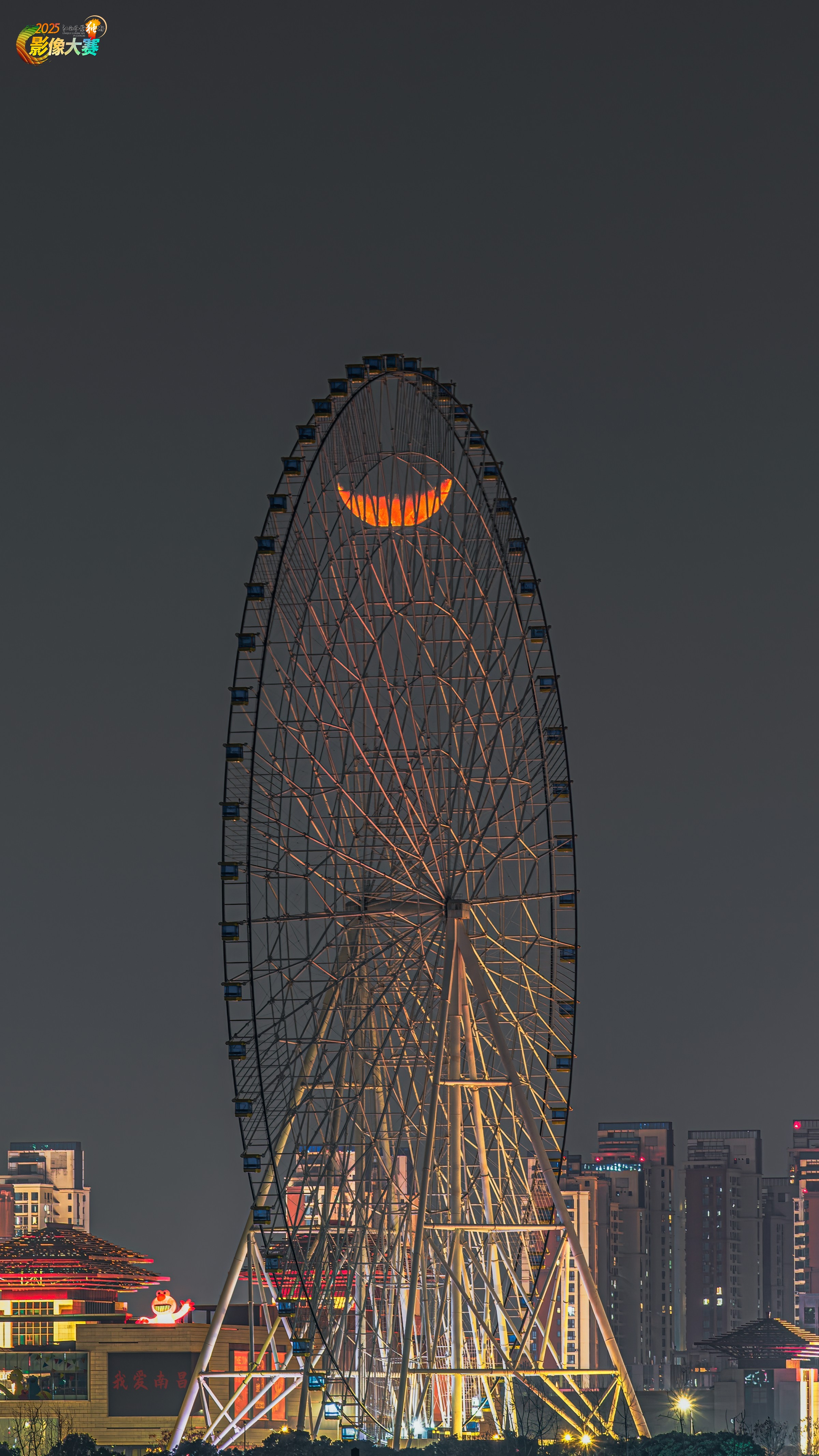 拍摄于江西南昌朝阳江滩公园,拍摄目标南昌之星摩天轮,峨眉月与太阳(日落)