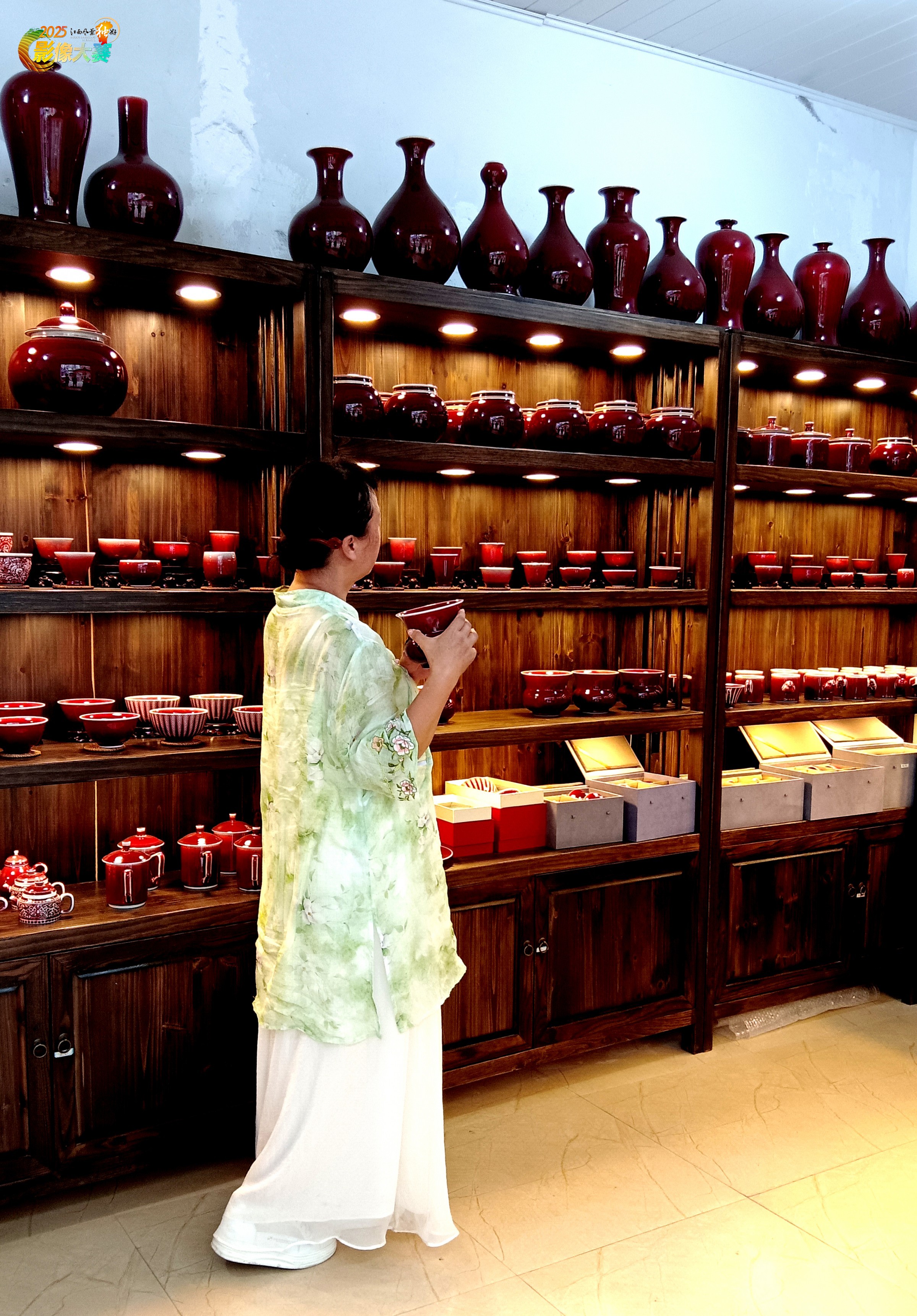 褐红色的瓷器在女子的鉴品中散发着古色古香。