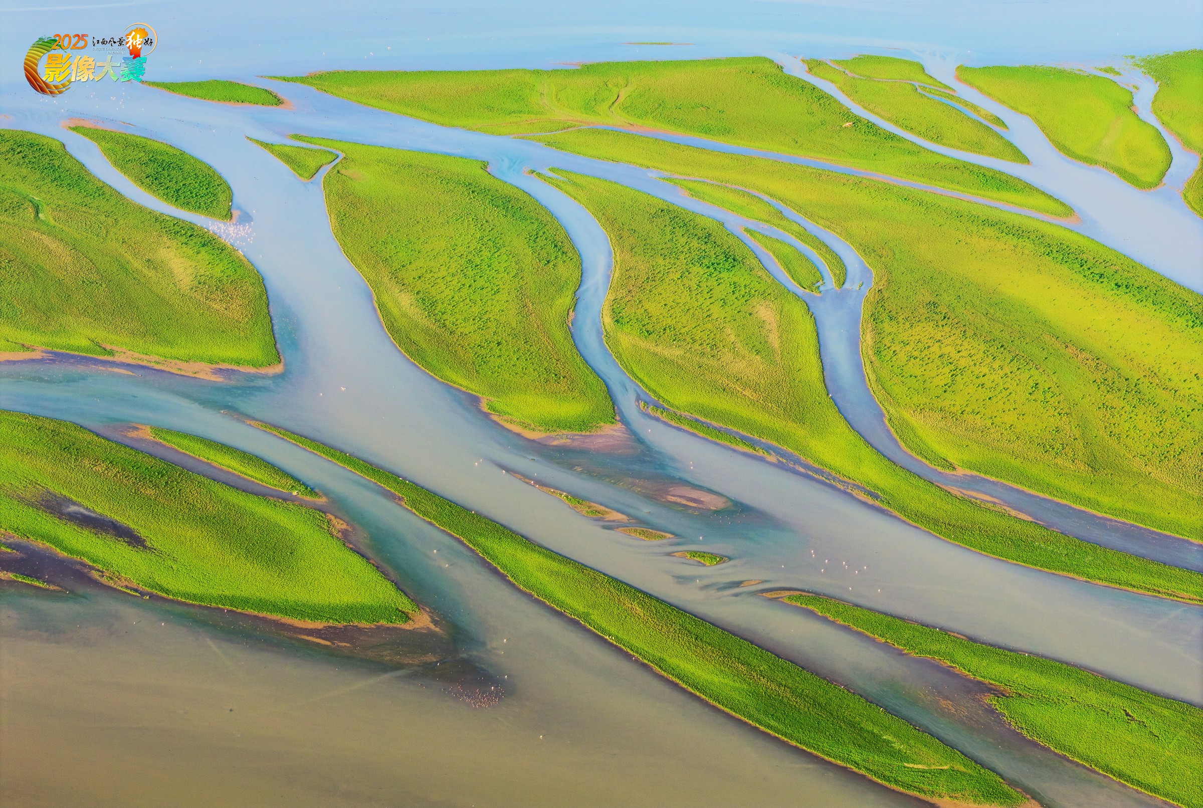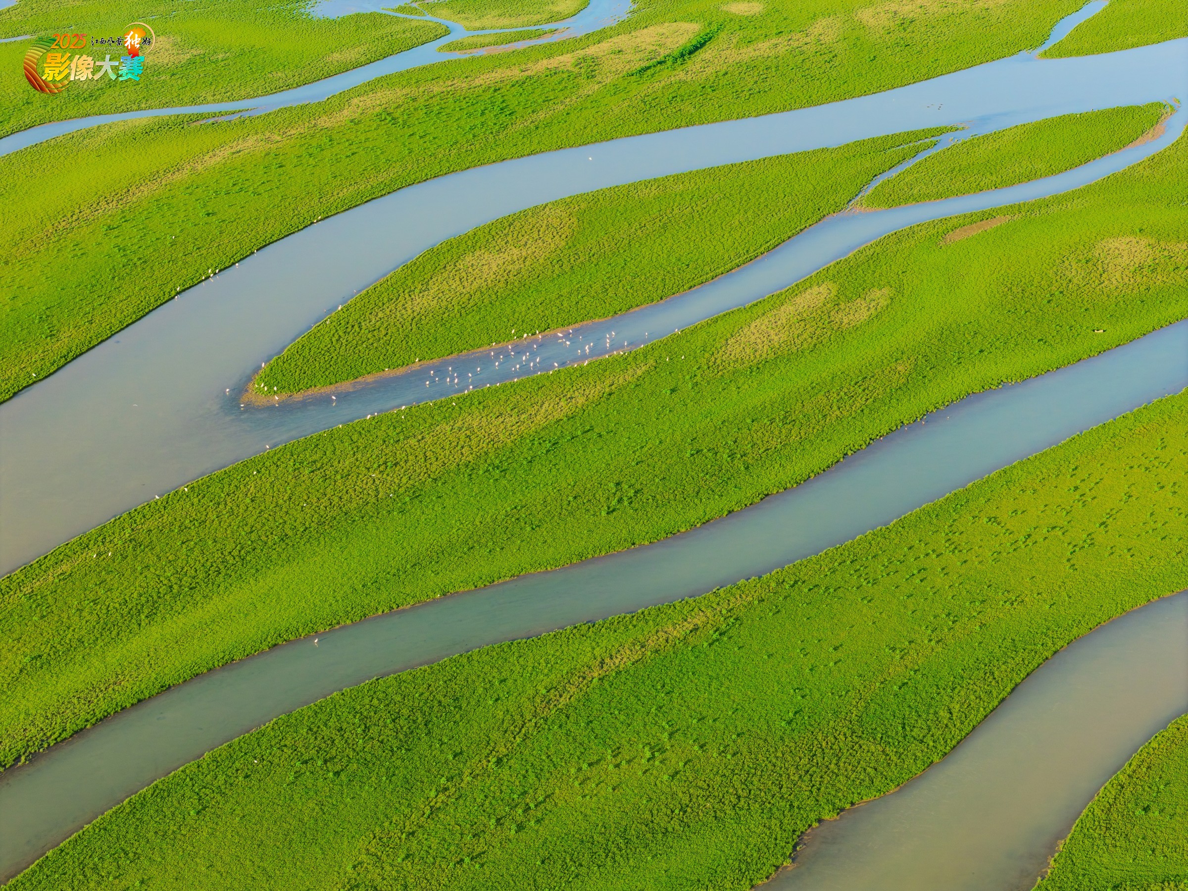 金溪湖湿地退水后,露出了形态各异的草洲,线条非常优美,草地和水面上散落着一些栖息觅食的鹭鸟,象是一幅幅美丽的生态画卷。