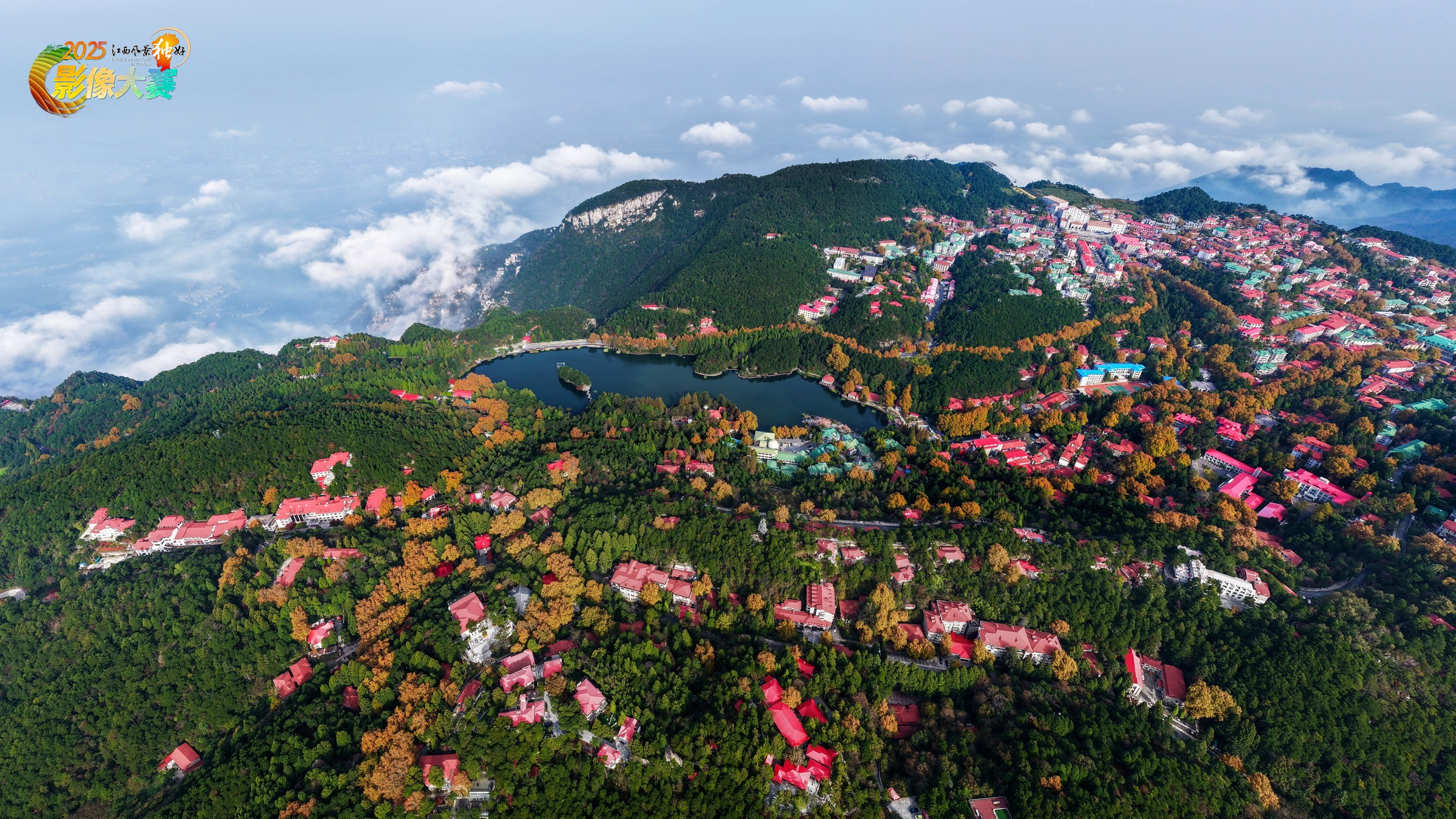 图片拍摄于2025年11月1日,拍摄地:江西庐山。这是一幅航拍的庐山牯岭山城秋景图。画面中,山峦被茂密的森林覆盖,翠绿与金黄的林木交织,呈现出浓郁的秋意。山间分布着大量红顶建筑,色彩斑斓的房屋与山林相映成趣,构成了一幅充满生活气息的山居画卷。中间的湖泊如翡翠般镶嵌在山林之间,增添了灵动之美。远处云海缭绕,与蓝天相接,更显画面的开阔与空灵。整体展现出人与自然和谐相融的绝美意境,既有山林的静谧悠远,又有小镇的烟火温情。