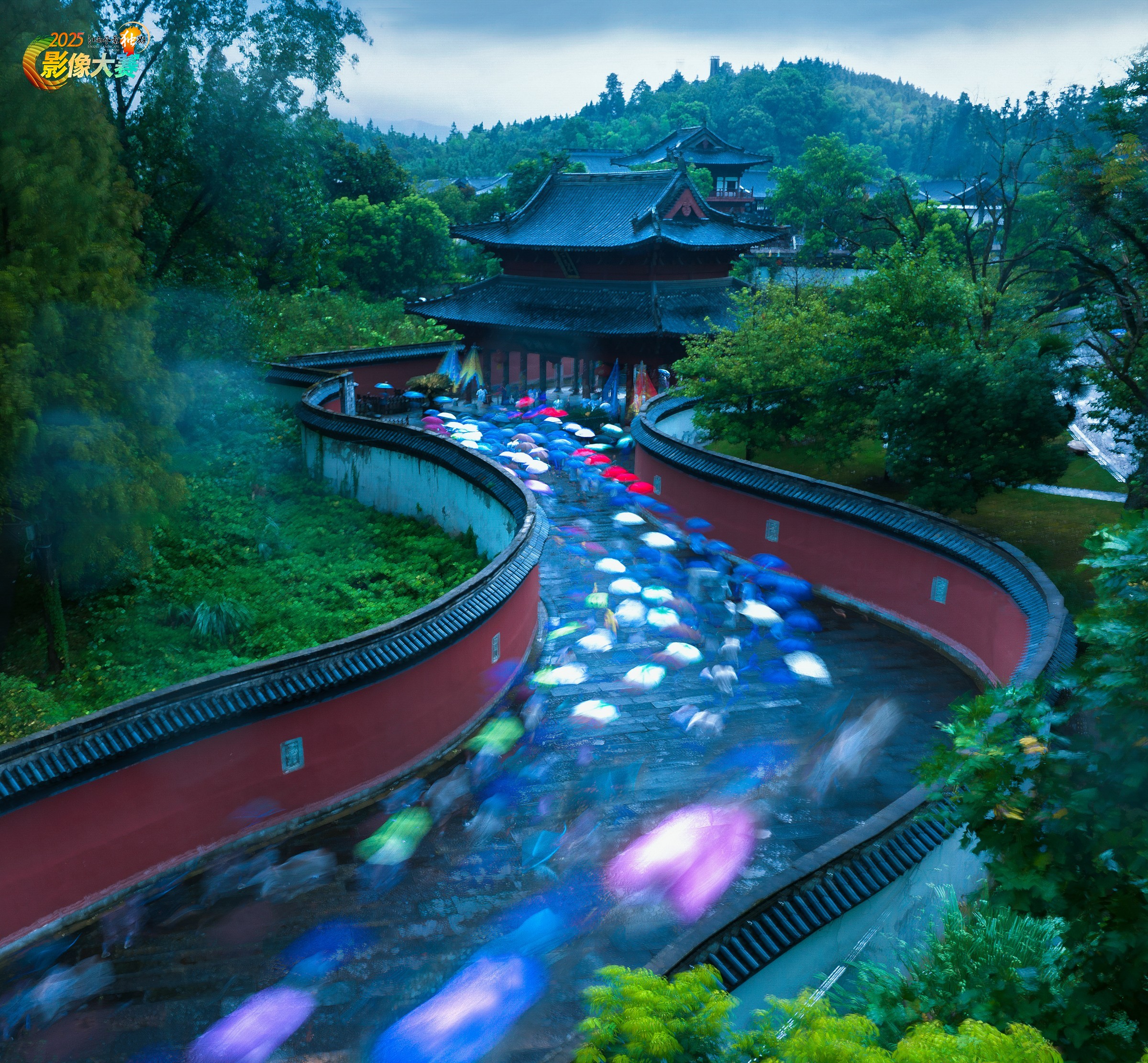 《大上清寻道》以慢门加堆栈的表现手法,记录龙虎山大上清宫的寻道场景:细雨中,游客与信徒手持彩伞,沿蜿蜒红墙缓缓前行。慢门技法让人影流动如光,与古刹的静谧形成对比,尽显对道教发源地的虔诚与敬仰