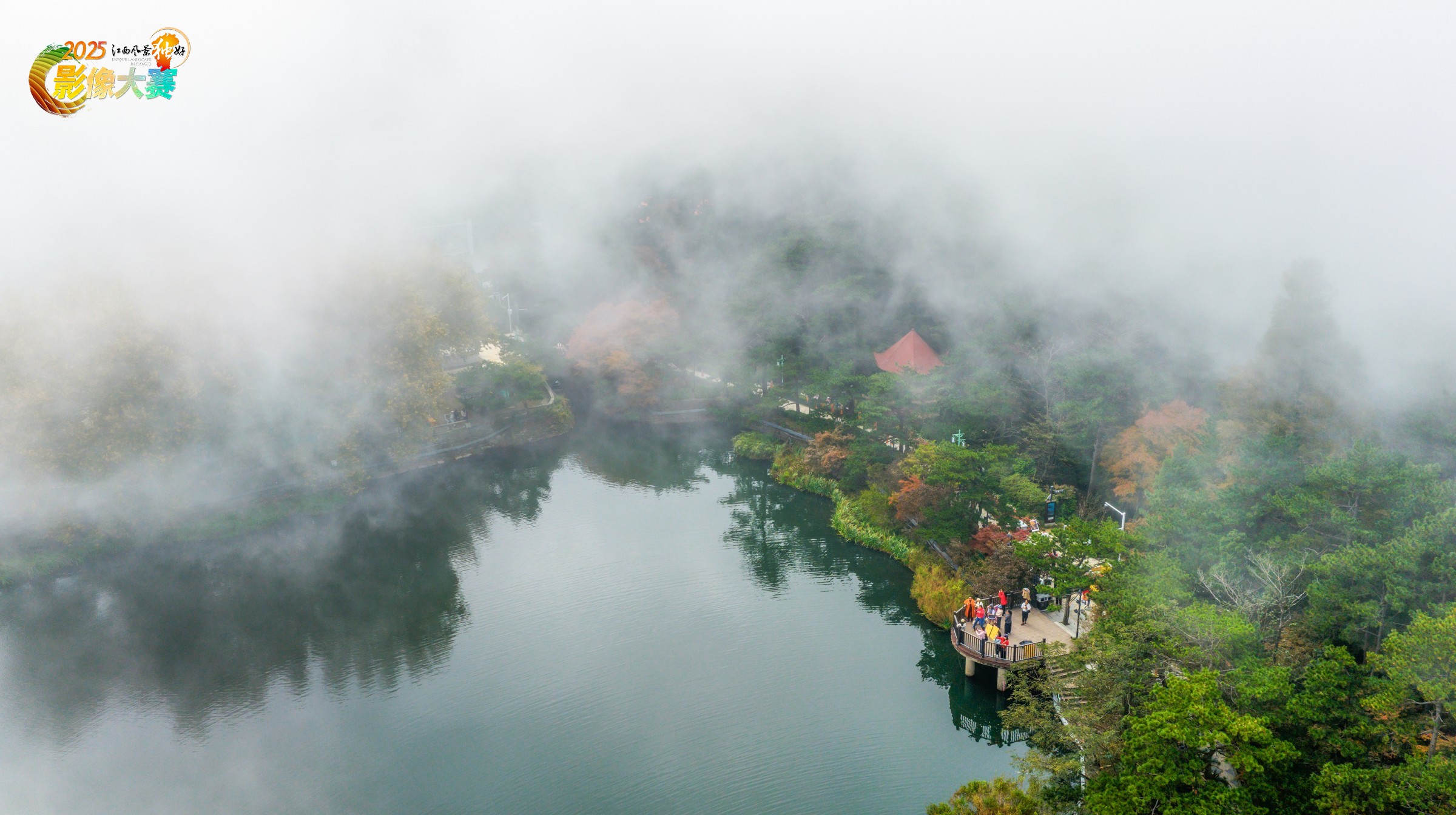 图片摄影于2025年11月1日,拍摄地:江西庐山。这是一幅充满朦胧诗意的湖山雾景图。画面中,一汪碧湖静卧于山林之间,湖水澄澈。四周的山林被秋意浸染,一处红顶建筑隐于林间。厚重的白雾如轻纱般弥漫在湖山之上,将景色半遮半掩,营造出 “雾锁湖山,林隐幽境” 的空灵氛围。湖畔的观景平台上,几人驻足观景,为这片静谧的自然画卷增添了一丝人间烟火气,整体传递出悠远、静谧且富有诗意的美感。