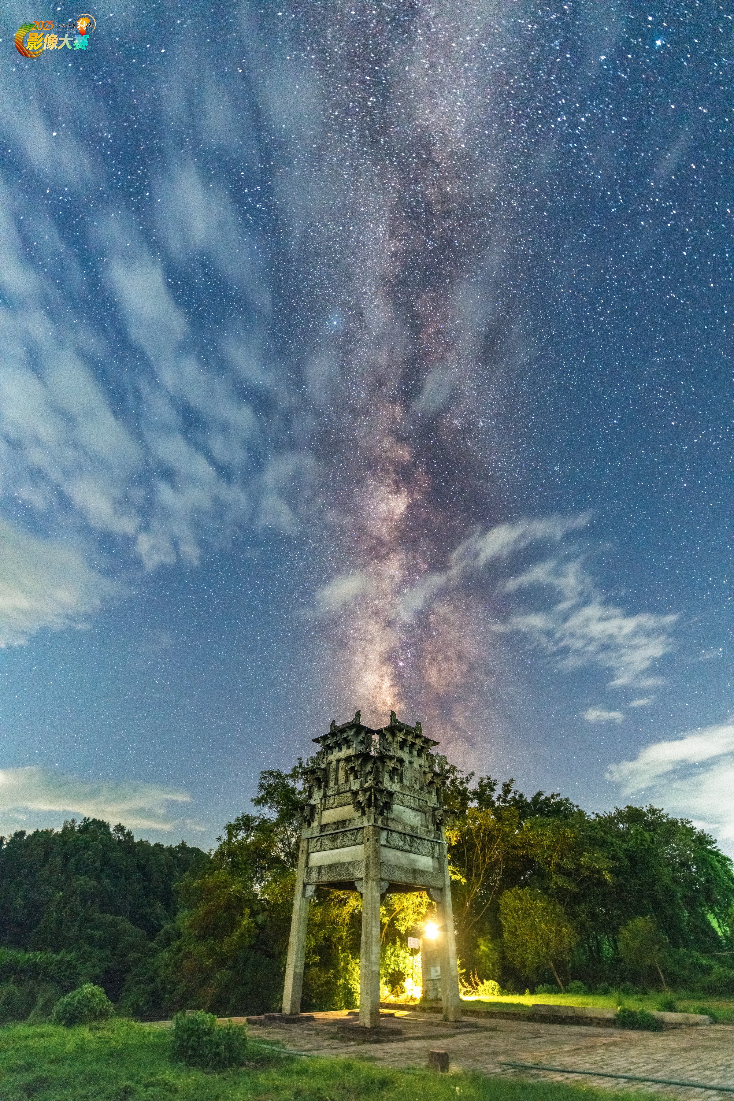 本作品无意创造一幅甜美的风光片。它旨在完成一次极致的“并置”:将江西奉新潦河畔,一座建成于1601年、全国唯二的四面牌坊,与宇宙中、横跨天际的壮丽银河,置于同一时空坐标。石坊的四面对称,代表着古人“天圆地方”的宇宙观与对秩序和谐的追求;而银河的垂直显现,恰似宇宙对其观念的一次盛大印证。白云的遮掩为这幅画面注入了呼吸感与神性,仿佛时空在此刻变得可读:石坊是大地写给历史的一封信,而银河,则是宇宙覆予它的、光芒万丈的邮戳。