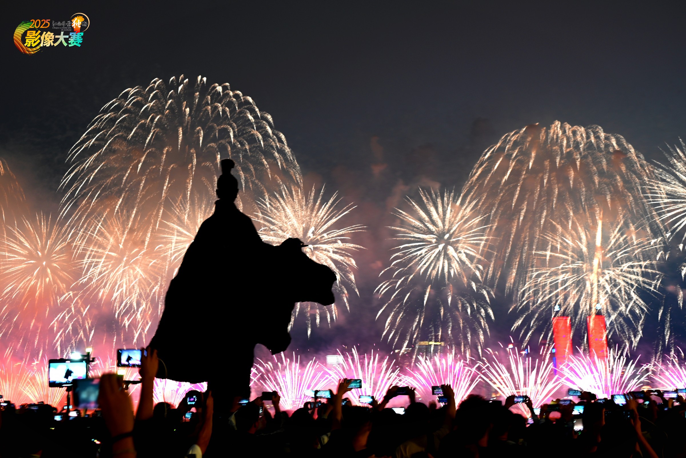 2023年10月1日南昌国庆烟花秀。王勃雕塑伫立在人群之中,仿佛与人们一同欣赏盛大的烟花表演。假如王勃穿梭千年,重登滕阁,眺望赣江两岸已是高楼林立,万家灯火,他将泼墨写下怎样的诗篇?