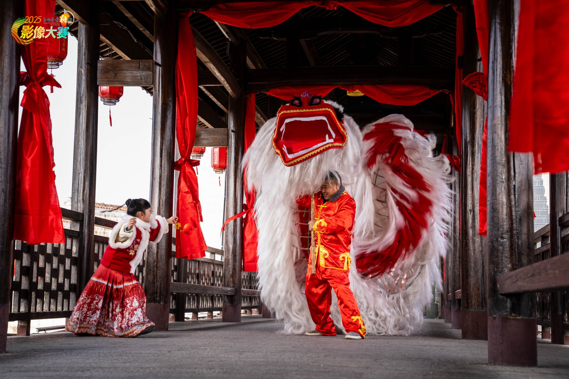 舞白狮一直是黎川县日峰镇下桥村一种民间灯彩舞蹈,因下桥坐落在县城的西北方,故又称之为“西方白狮”。2013年黎川舞白狮列入第四批国家级非物质文化遗产名录。黎川旧时有喜庆必放炮竹、舞白狮的习俗。据《黎川县志》记载,舞白狮早在晚清时就已在黎川出现,尤其是春节贺岁,大年初一清晨就有狮子拜屋。世俗认为,狮子有“兽中之王”之称,在门前张大巨口舞弄一番,那些躲在屋角旮旯中的恶鬼邪魔就会一扫而光,有“旺屋”作用。为进一步传承弘扬中华优秀传统文化,促进广大人民群众对非物质文化遗产的保护和认知,进一步推动非遗保护与百姓生活的融合,舞白狮时常亮相在黎川古城景区展演,为游客、当地居民们呈现一场视觉盛宴的同时,来进一步传承弘扬中华优秀传统文化。图片记录的是,孩童与表演的白狮互动的镜头。