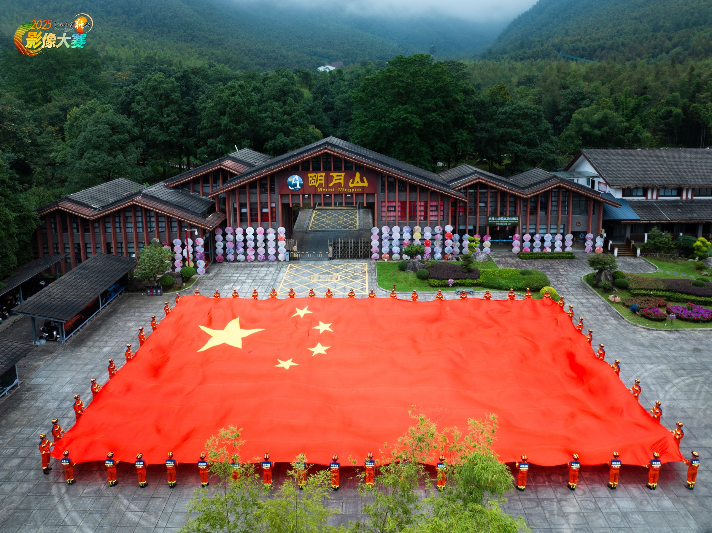 近百名消防员展开600平方巨幅国旗在明月山为祖国庆生。