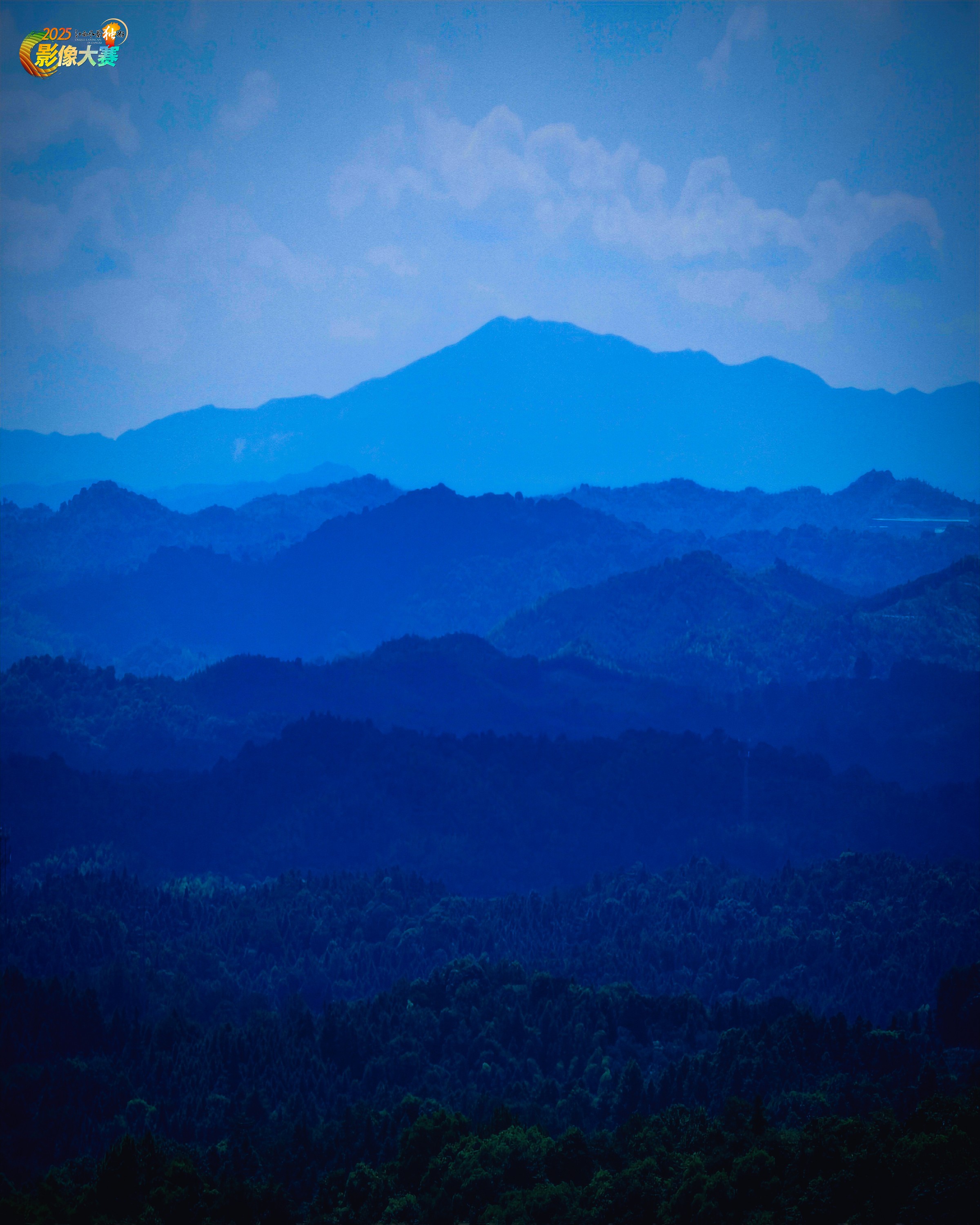 以蓝调意境呈现江西新余的山峦群像,层叠的峰峦在云雾与光影中晕染出深浅不一的翠色,如自然挥毫的水墨长卷。千峰竞秀,翠意天成,既展现赣地山水的原生之美,又通过色彩的层次营造出“咫尺千里”的空灵意境,是对自然山水天成之态的诗意定格。