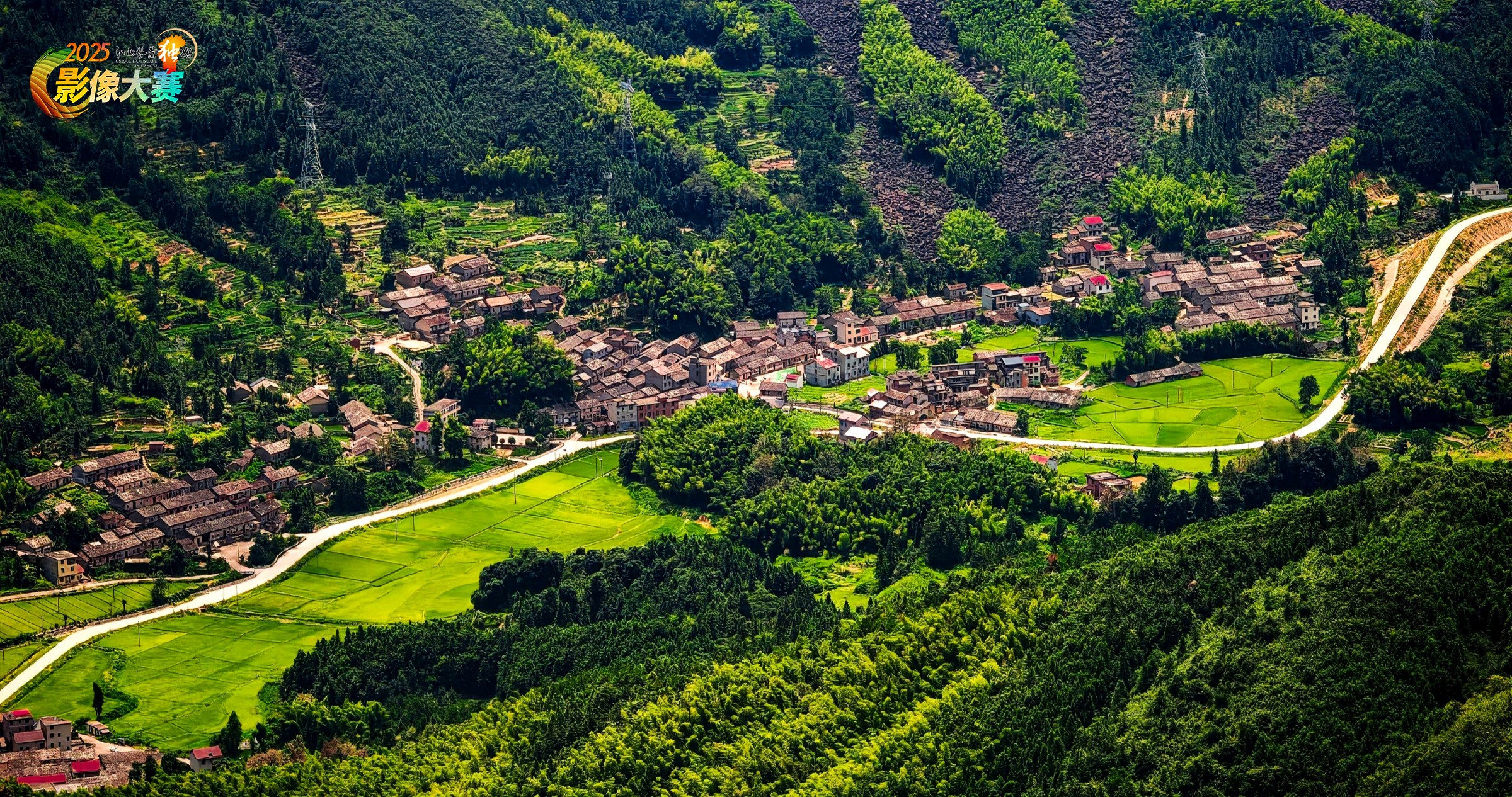 呈现江西丰城的山水村落图景,葱郁山峦如绿毯铺展,蜿蜒道路似银带穿梭,村落与田野在自然怀抱中错落成趣。它是山水天成的生活长卷,将赣地的山之灵、水之秀与人文通达的烟火气融为一体,尽显“路通山水处,村在画图中”的原生意境。