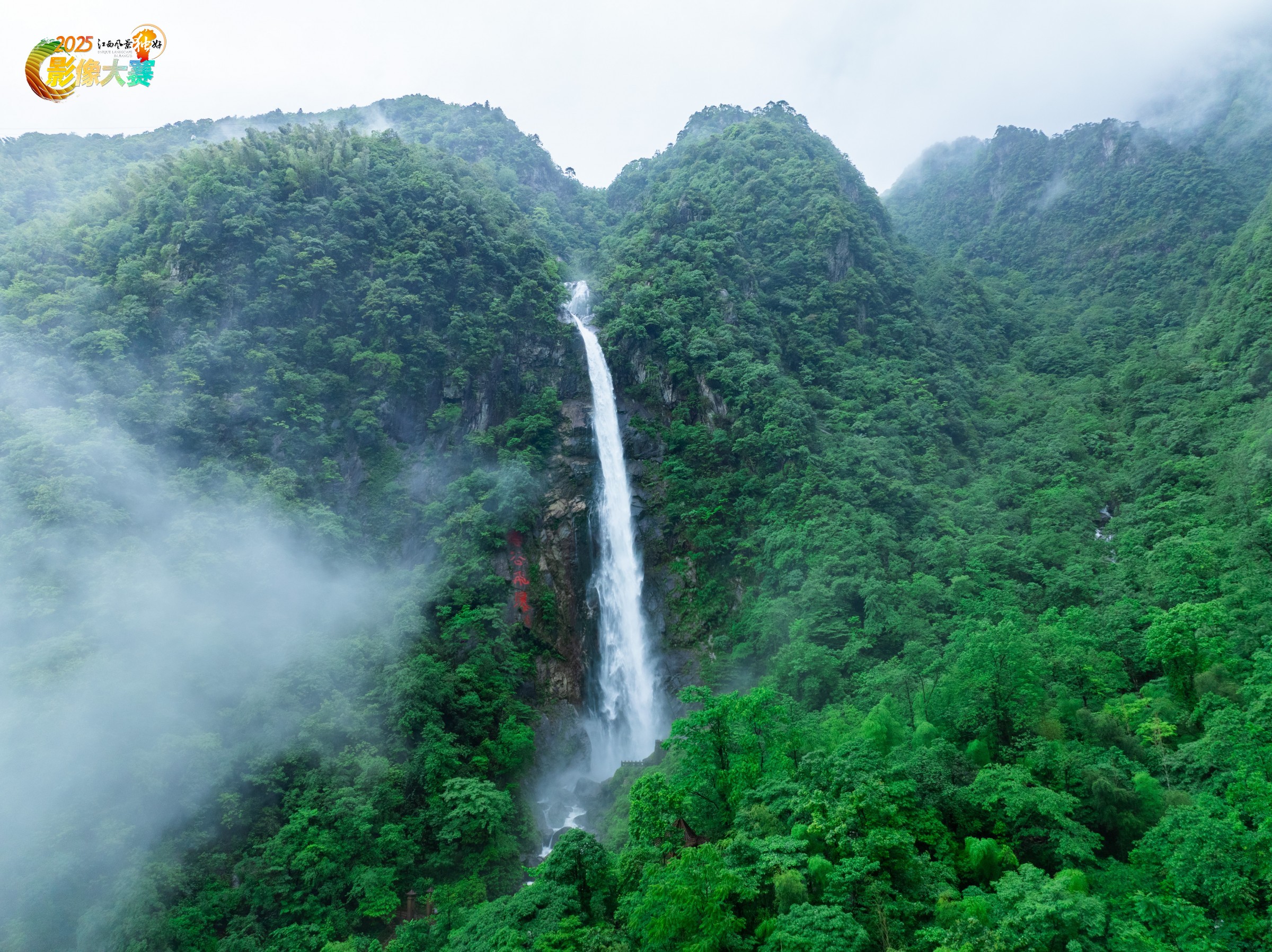 雨后山间雾气缭绕,瀑布在云雾之间奔腾而出。
