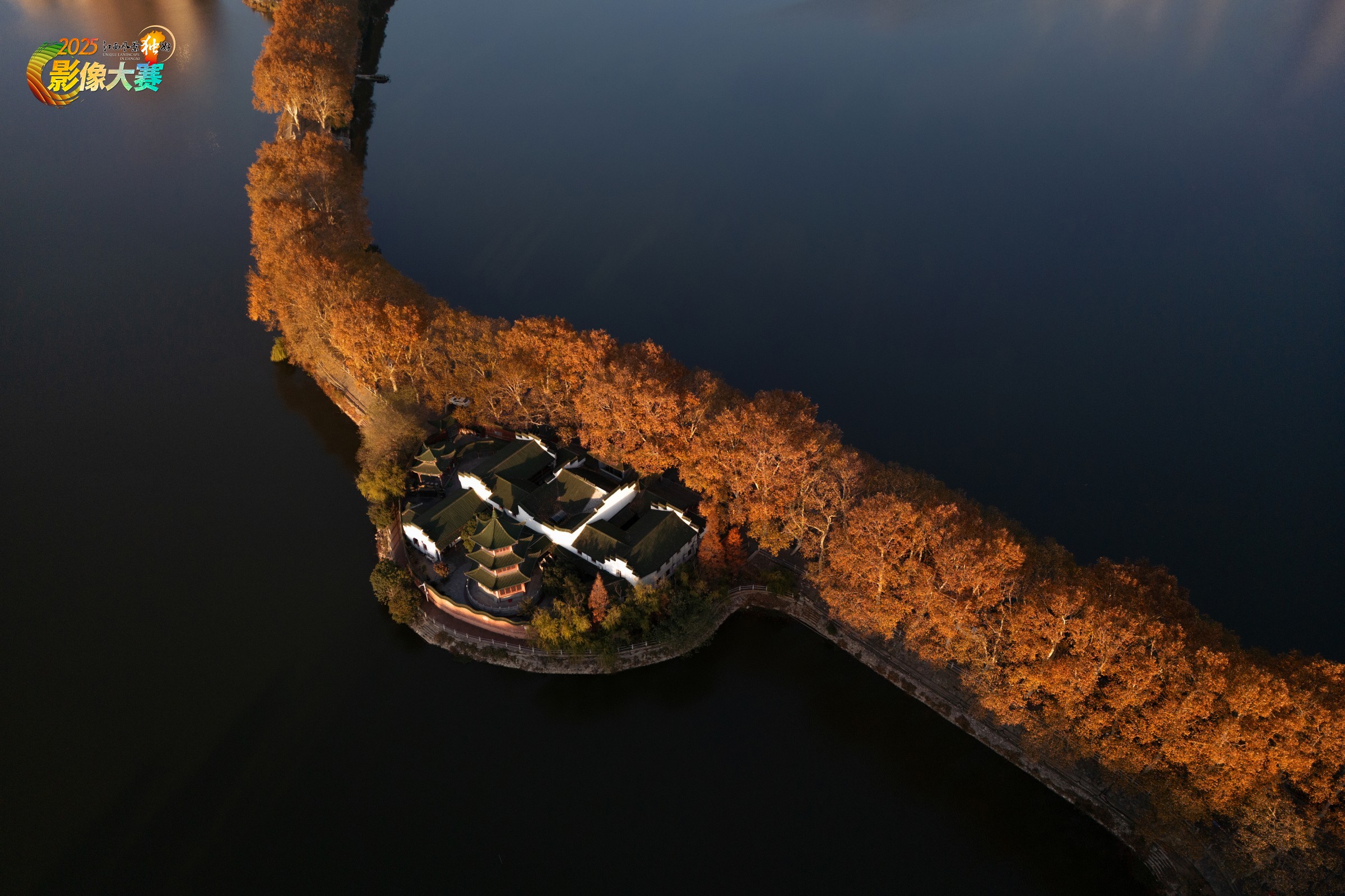 观音阁位于江西省九江市浔阳区李公堤南侧的甘裳湖上,深秋时节,李公堤上的梧桐树已是一片金黄,湖水之上观音阁掩映其中如诗如画。