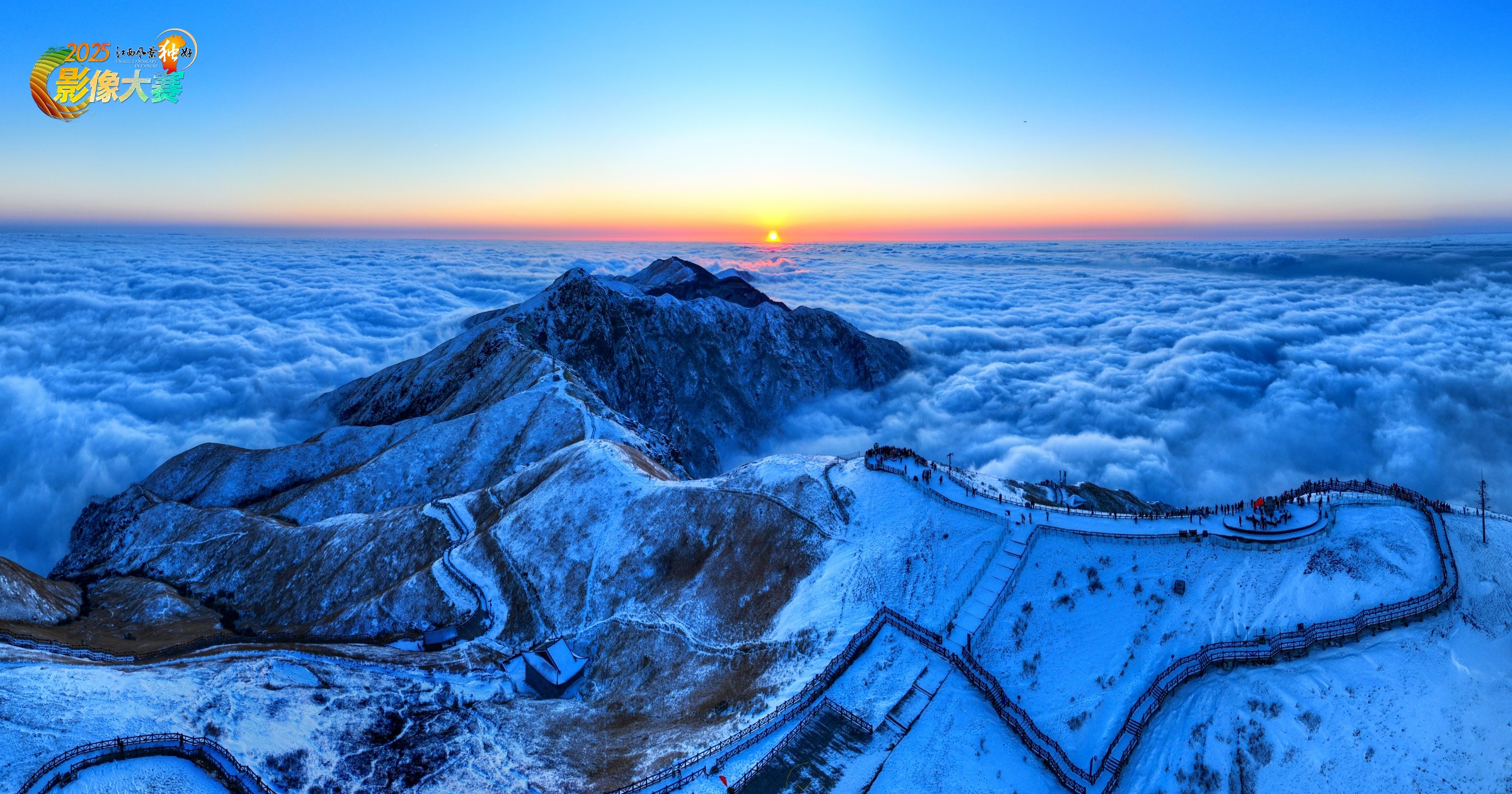 武功山覆雪成银,群峰隐于云海之上,夕晖轻染雪巅,暖橙与冷蓝交织出清冽又温柔的色调。山径与观景台嵌于雪原间,既显江西生态冬日的纯净壮阔,也将“雪裹青山沐晚光”的静谧诗意,凝作绿色家园的别样风姿。