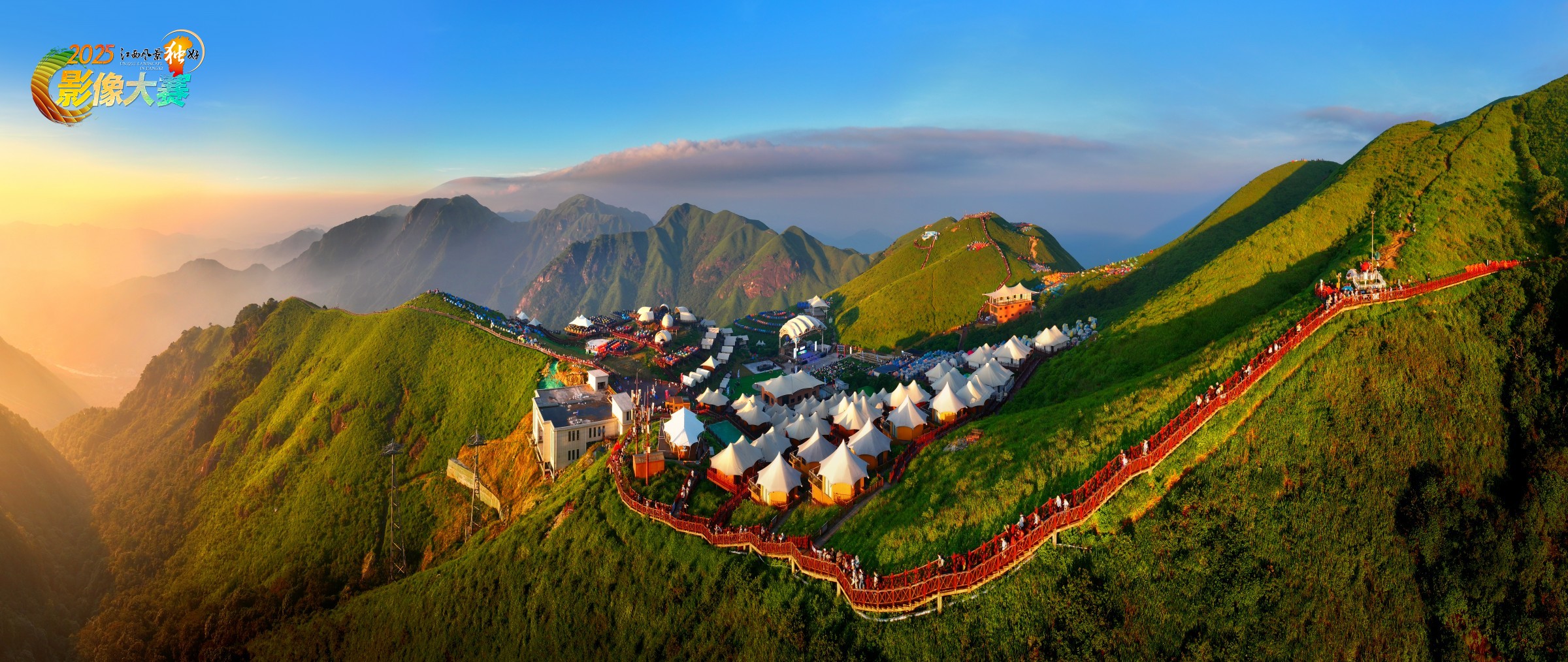 武功山帐篷节之暮,白帐簇满青绿草坡,夕晖染就暖金底色,红径串起人流与营帐,远山叠嶂隐于雾霭间。光影裹着山野生机,既显江西生态的清新和洽,也将“营帐拥坡、晚晖裹青山”的鲜活盛景,凝作绿色家园的生动注脚。