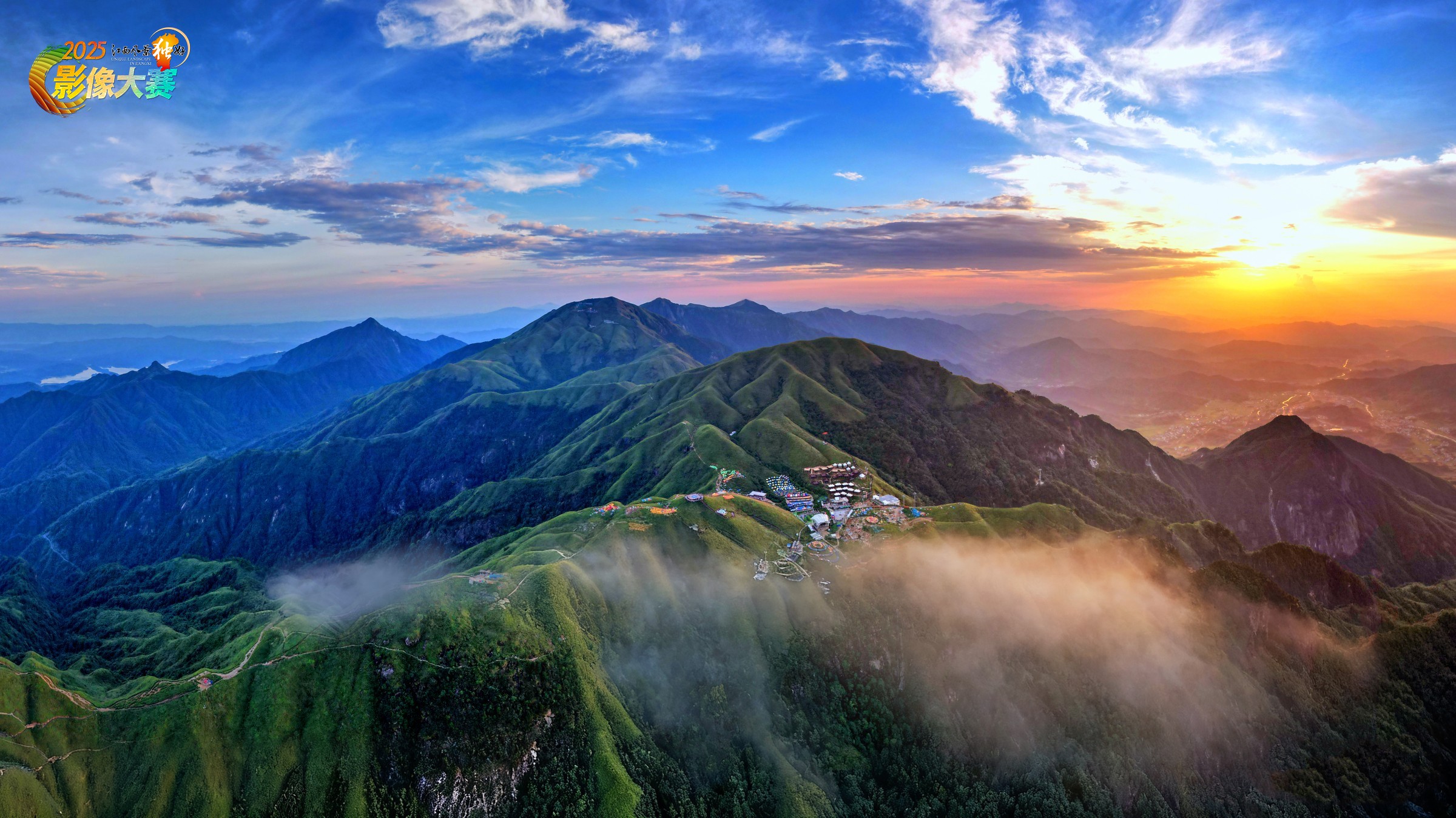 夏季武功山,青嶂裹着弥蒙云雾,山巅营地隐于烟岚间,夕晖铺染出橙蓝交织的暖调。层峦、云浪与晚光相融,既显江西生态夏日的清新壮阔,也将“云缠夏山、夕照营巅”的灵秀生机,凝作绿色家园的鲜活图景。
