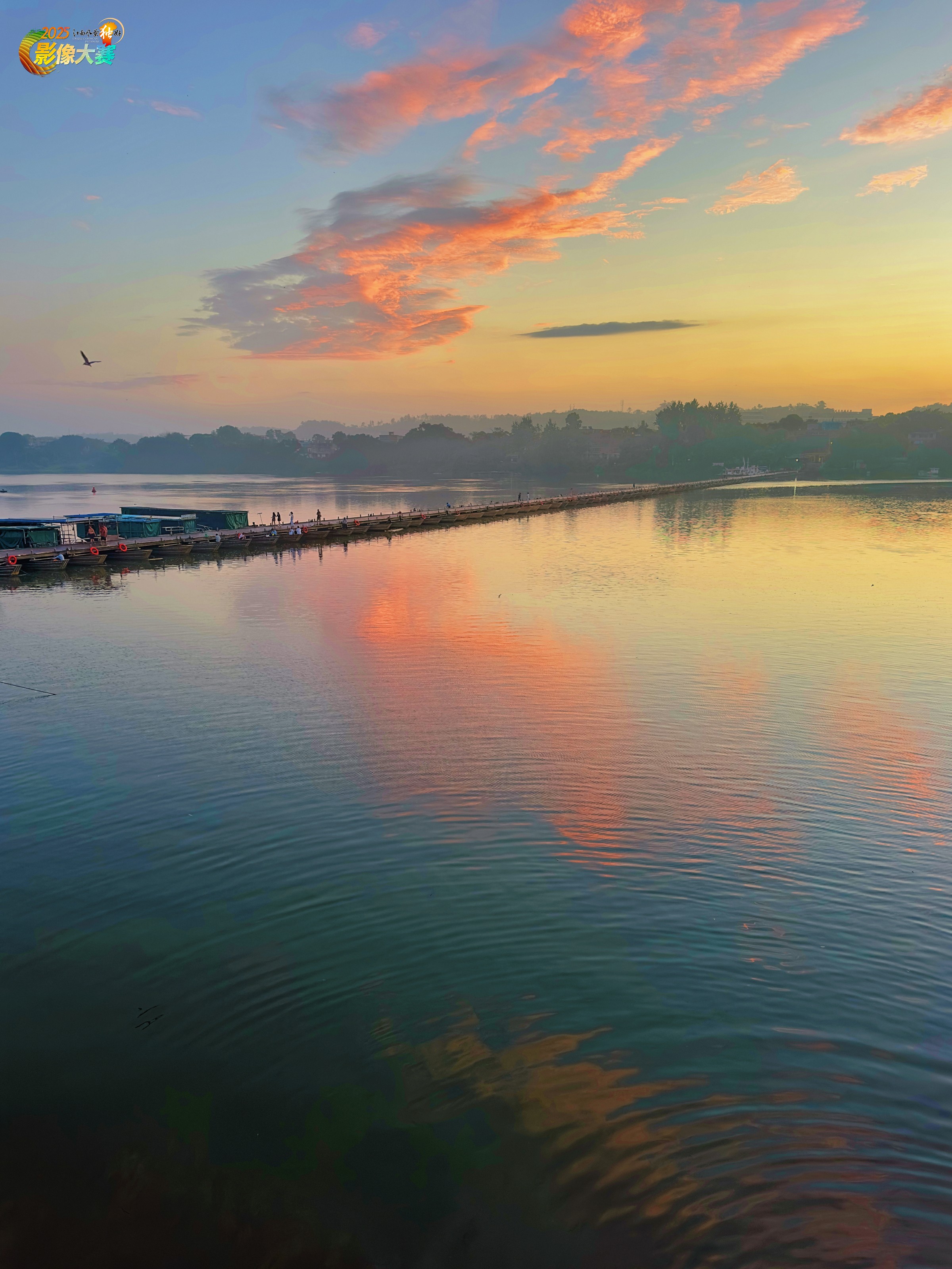 2025年7月24日拍摄于赣州市建春门古浮桥。破晓时分,建春门旁的贡江成为天地交融的画布。炽热的桔红色霞光如熔岩般倾泻,将天空与水面的界限彻底融化,构筑成一个宏大而纯粹的色彩剧场。古浮桥以其独特的几何线条横亘其中,桥上稀疏的人影点缀出生活的尺度。恰在此时,一只飞鸟划过这片浓郁的金色,其灵动的剪影不仅打破了画面的绝对宁静,更如同一枚自然的印章,为这幅浑厚的画卷题写了生命的注脚。