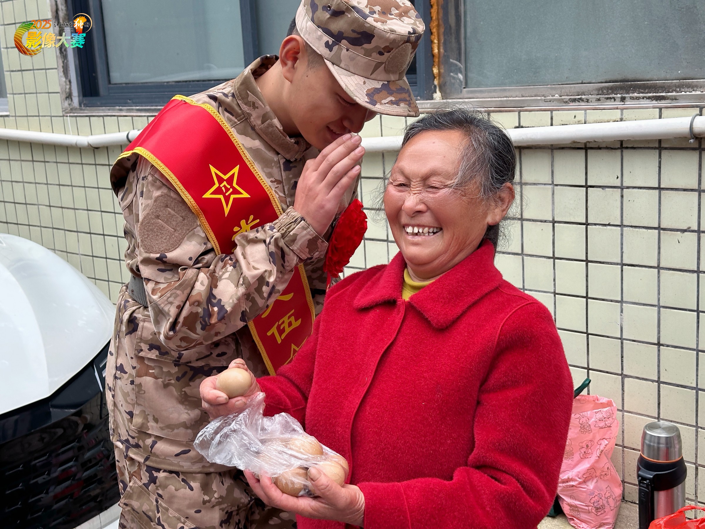 2025年3月15日拍摄于赣州市于都县。这幅作品定格了新兵入伍前与奶奶话别的温情瞬间。身着崭新戎装、胸戴红花的新兵,像个孩子般俯身贴近奶奶耳边,进行着临行前的悄悄话。奶奶的笑容慈祥而自豪,手中小心翼翼捧着的,是刚刚煮好、还带着温热的茶叶蛋。这个简单的动作,承载了千言万语的不舍与嘱托,将“儿行千里母担忧”的亲情与“报效国家”的豪情完美融合,展现了军民鱼水情背后最质朴、最动人的家庭根基。作品决定性瞬间的捕捉与情感叙事:摄影师拥有敏锐的洞察力,成功捕捉到了人物互动中最富感染力的瞬间。新兵俯身的姿态与奶奶仰头倾听的姿势,构成了一个充满动感与温情的闭环。这种不经摆拍的真实互动,使照片充满了故事性和情感张力,超越了简单的记录,升华为一个关于爱、责任与传承的视觉故事。细节刻画与质感表现:对细节的刻画十分到位。光线清晰地勾勒出奶奶脸庞上深邃的皱纹、饱经风霜的双手以及土豆粗糙的表皮,这些细节充满了岁月的质感。与此同时,新兵军装笔挺的布料质感也得到了清晰呈现。这种新与旧、细腻与粗糙的质感对比,进一步丰富了画面的层次,增强了视觉的真实感和触动人心的力量。照片最打动人心的是奶奶手中那几枚普通的茶叶蛋,是整张照片的“情感眼”。它不再是简单的食物,而是家乡的味道、亲人的牵挂和无声的嘱托的象征。这个细节极大地升华了主题,让宏大的“参军报国”叙事回归到最真实、最细腻的家庭情感之中,极具感染力。