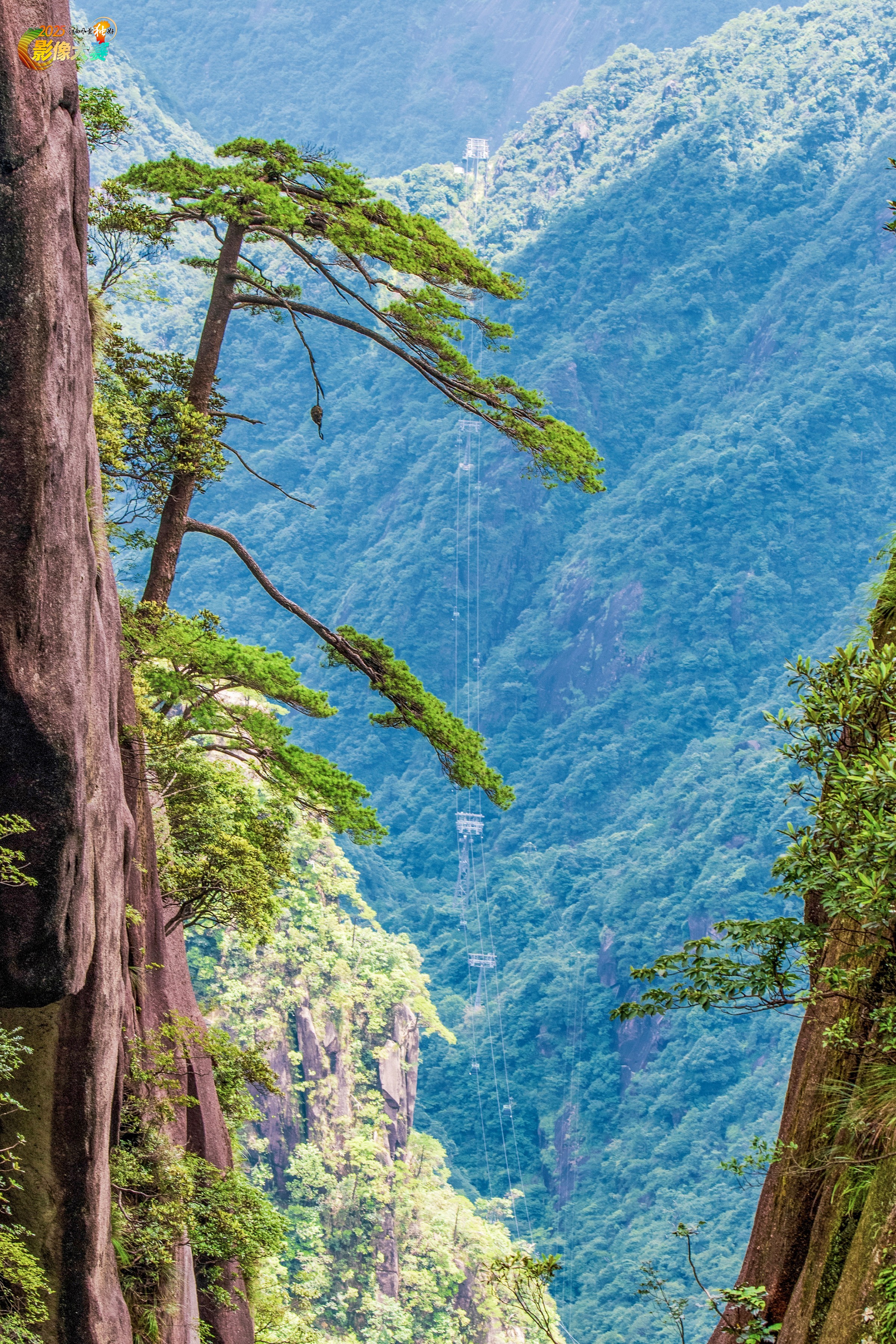 三清山外双溪索道上方悬崖壁上的一颗松树,就像迎客松一样欢迎八方来客。2025.7月摄。