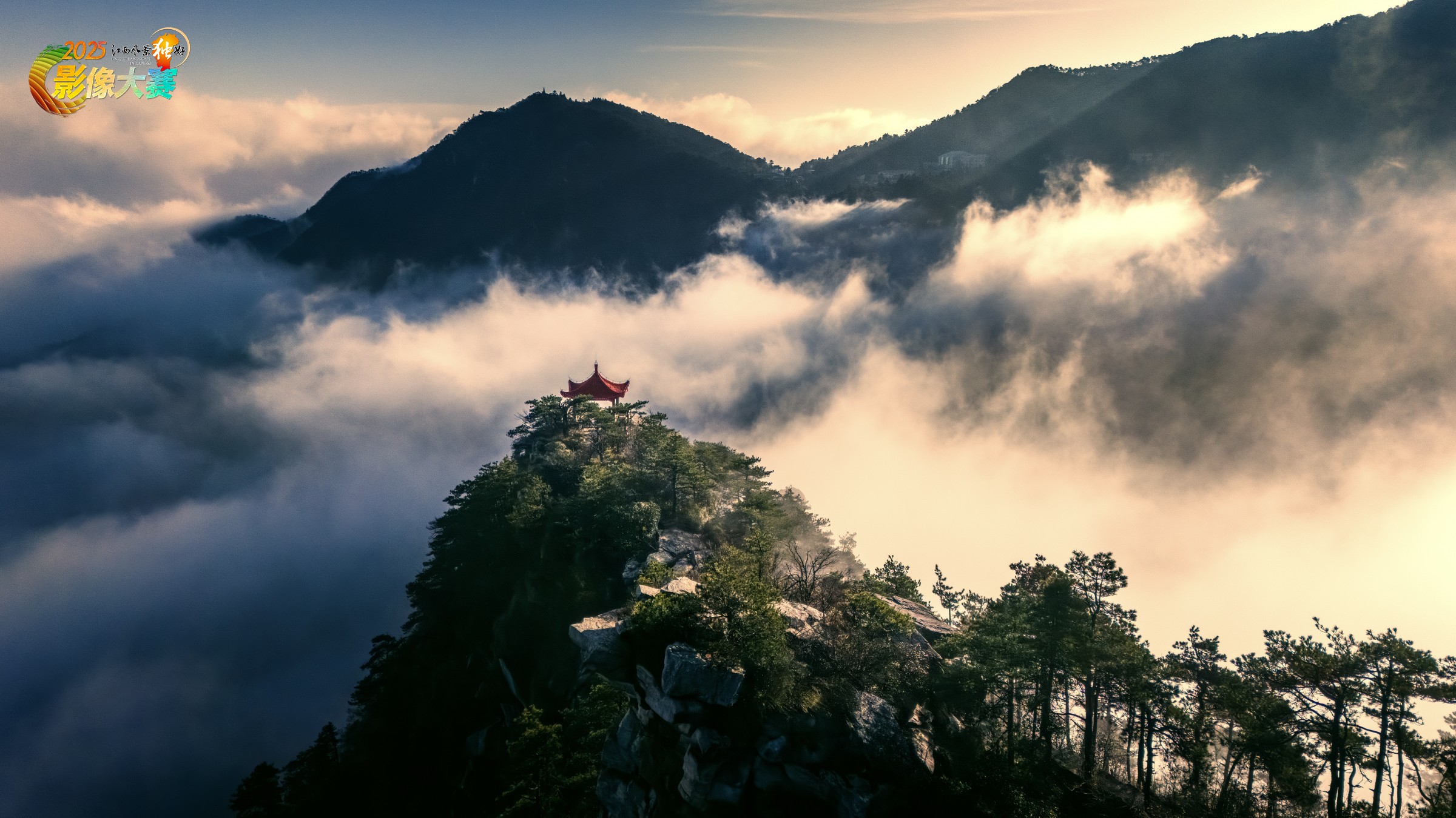 作品《庐山观云亭》拍摄于2024年3月,这幅航拍作品以独特的鸟瞰视角,将观云亭置于翻涌的云海之巅。远处层叠的山岚在光影交错间若隐若现,流云如轻纱般缠绕着青翠峰峦。亭台在云雾中若浮若沉,日光穿过云隙洒下斑驳光影,营造出“云生胸壑,亭悬太虚”的东方意境。整幅画面既展现了庐山的磅礴气象,又捕捉到了中国山水画般的空灵韵味,让人顿生漫步云端、超然物外之感。