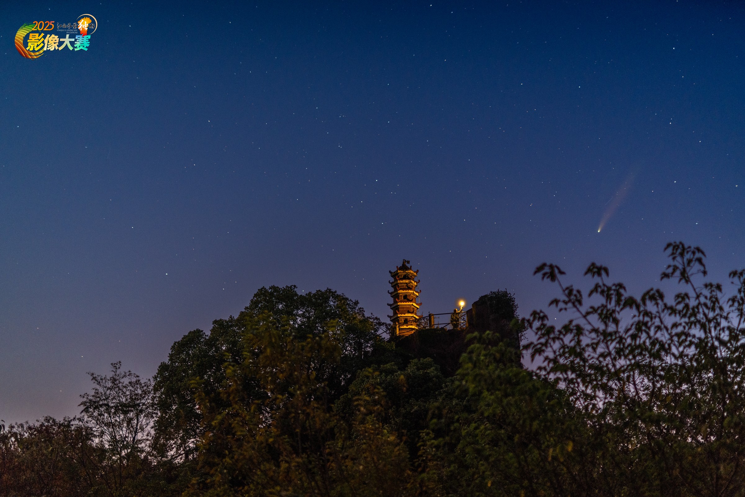 这幅作品于鄱阳湖畔拍摄。我以一盏灯的光辉,沟通了大地与星空:灯光照亮的是千百年来庇佑一方的平安塔,是赣鄱大地的历史记忆;而我们也在这片光中,共同仰望并记录下来自深空的莱蒙A6彗星。