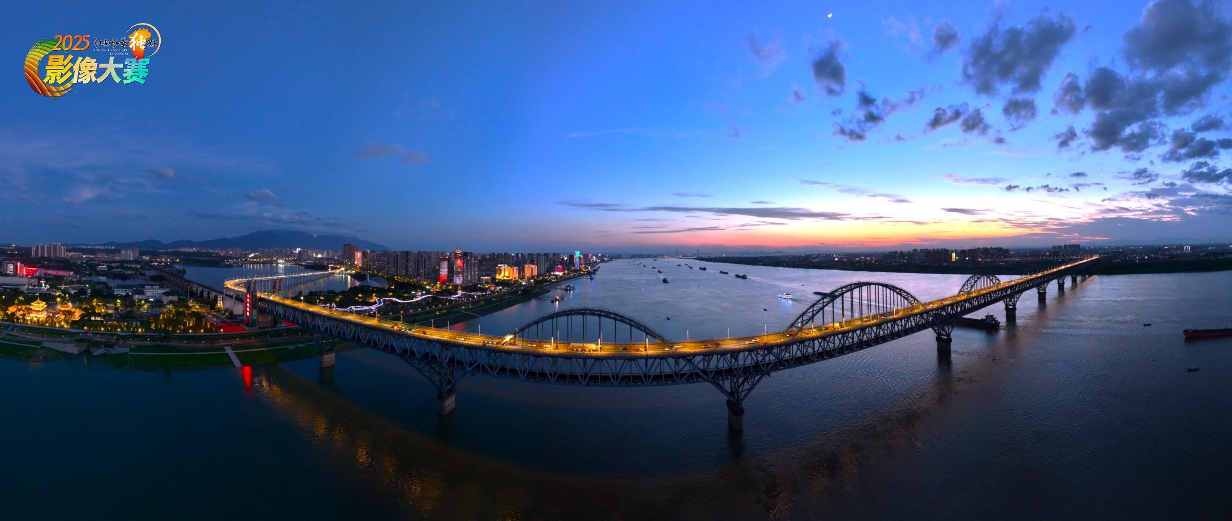 在浔城九江,长江之畔,日落晚霞,九江长江大桥,像是一座巨龙横跨长江天堑,仰望庐山。
