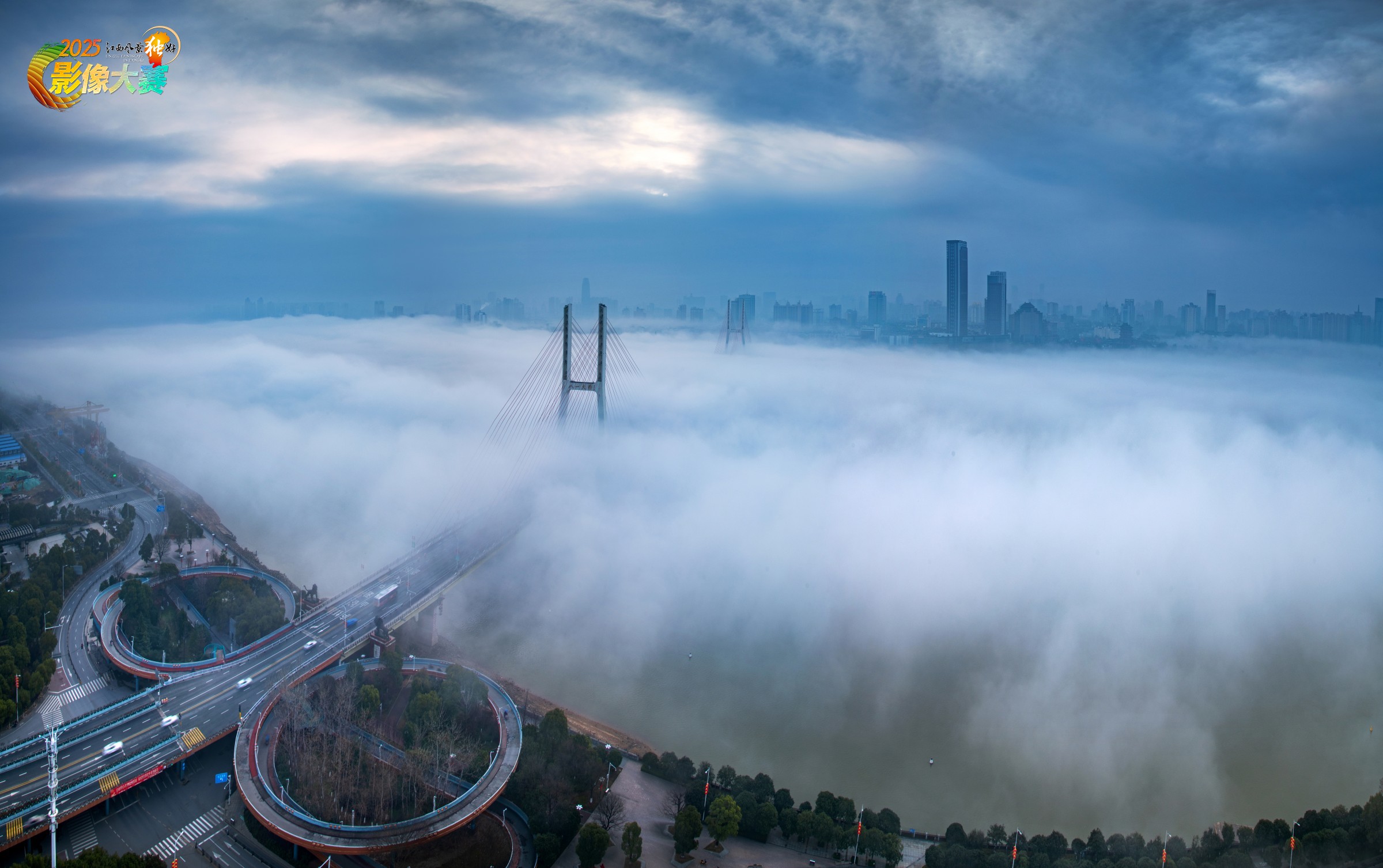 单反尼康D850相机拍摄,镜头24-85mm。难得一遇的云海自北往南(从扬子洲往八一桥)缓缓涌入整个赣江,似千军万马弥漫了整个八一桥,最后整个赣江被云雾笼罩,好似天上汹涌澎湃的洪水倾注到了整个赣江。