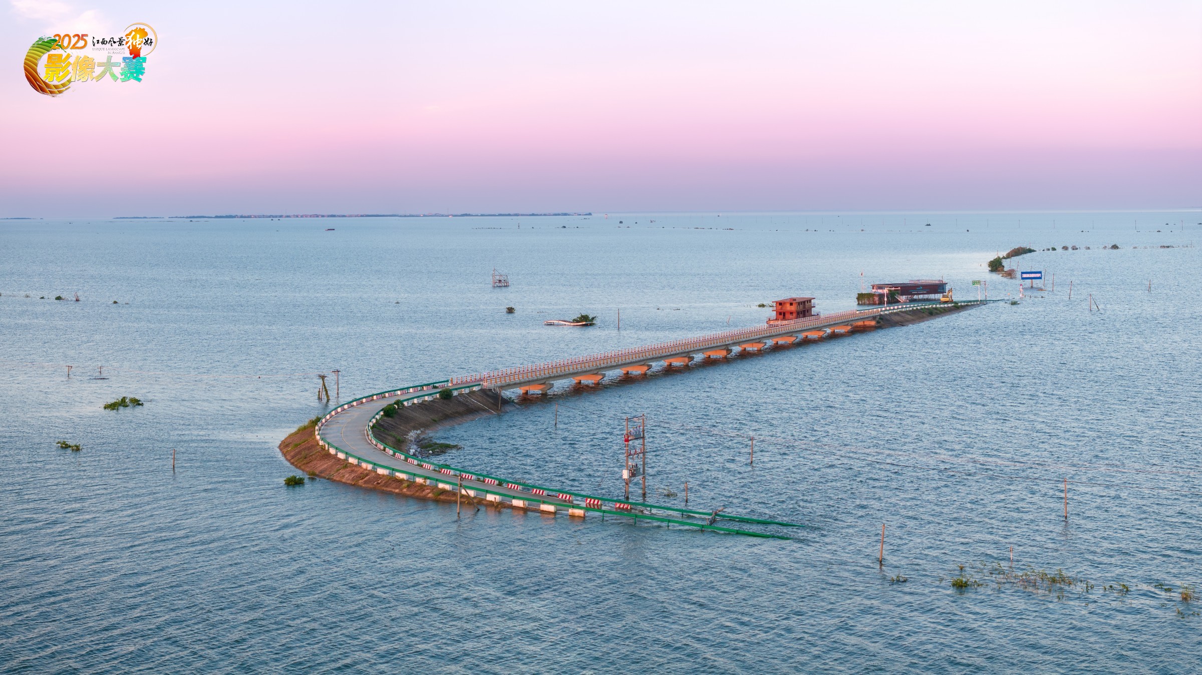 鄱阳湖的丰水期,被淹没的南矶大桥化身为一个巨大的“√”形标志,仿佛自然本身对这项人类的现代工程给予了最终的“确认”。天际线处,漂亮的粉红色维纳斯带为这一幕披上了浪漫的天幕。