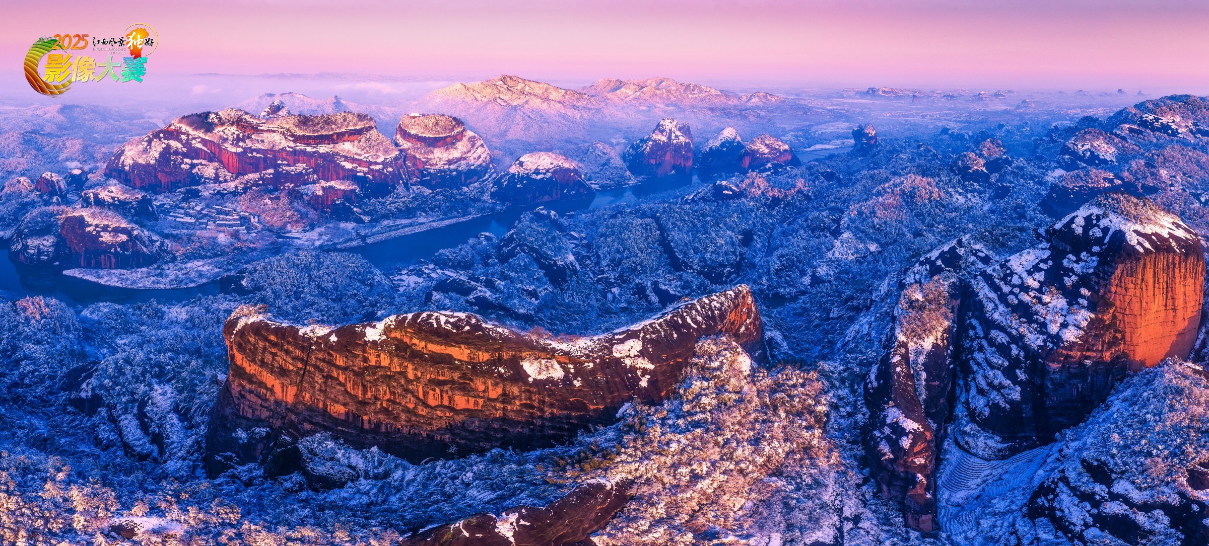 《龙虎画卷》以恢弘的全景视角,展现龙虎山雪后的独特魅力。丹霞赤壁与皑皑白雪相映成趣,河流如带,远山如黛,晨光中云雾缭绕,宛如一幅立体的山水长卷,尽显自然之美。