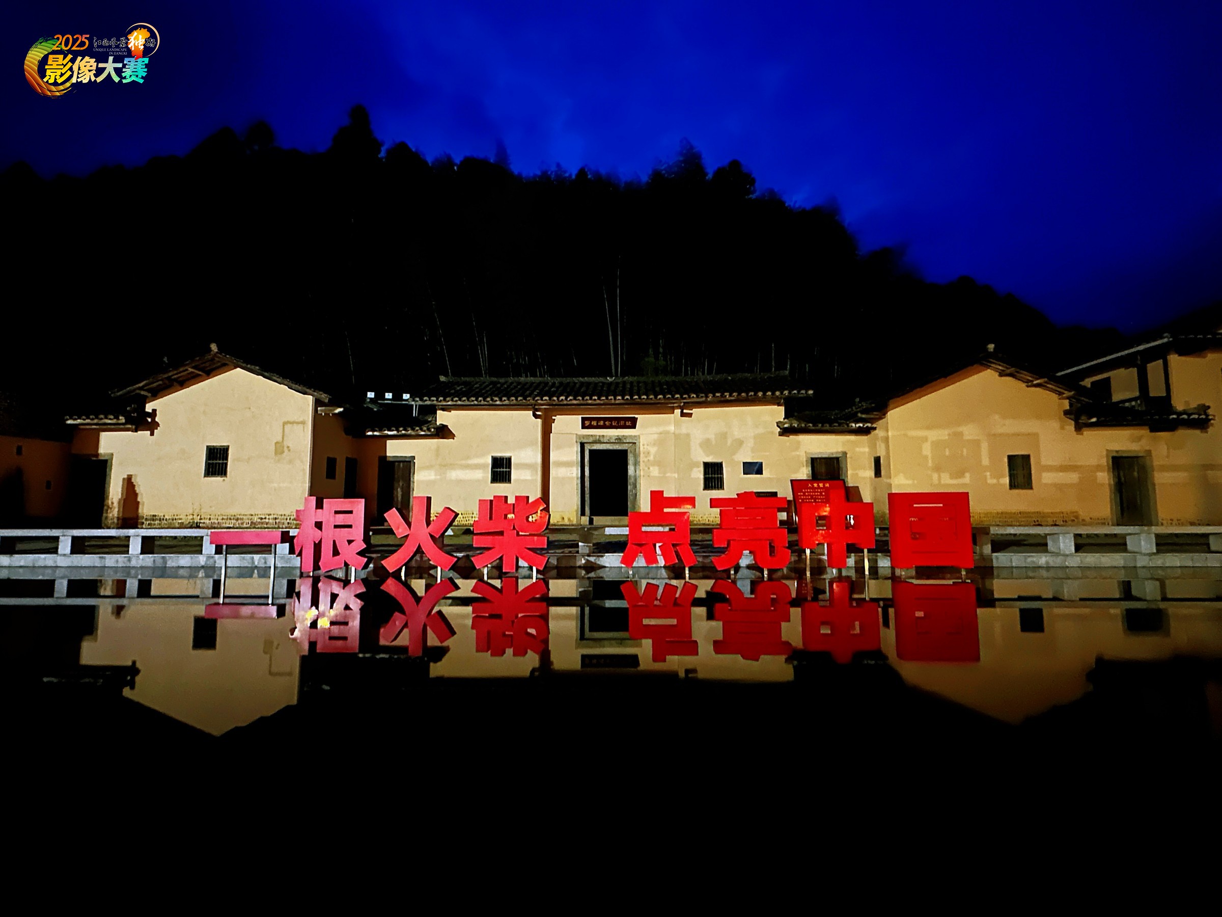 2024年10月18日拍摄于赣州市寻乌县项山乡福中村罗福嶂。蓝色的夜幕为罗福嶂会议旧址披上了一层肃穆的面纱。这栋建于1925年的土木结构瓦房,在1929年2月3日的寒夜里,成为了中国革命的一个关键拐点。毛泽东、朱德等在此主持红四军前委扩大会议,在困境中指明了方向。毛泽东在会议中用火柴取暖,提出关键决策,象征革命火种在困境中找到方向。会议的历史转折点:扭转红四军被动局面,为后续大柏地战役胜利奠定基础。 ‌党指挥枪实践:加强党的领导,成为古田会议的前奏。罗福嶂会议是党史、军史上的重要会议,是三湾改编之后、红四军成立以来,毛泽东大胆突破个人主义,实行党绝对领导军队的一次有益的大尝试;同时,进行了红四军下井冈山以来的第一次大整编。会议的正确决定,扭转了红四军下井冈山后的被动态势,成为后续创建中央苏区、革命力量展开绝地反击的重要转折。水面如镜,倒映着历史的轮廓与“一根火柴 点亮中国”的红色宣言——这不仅是建筑与文字的倒影,更是一个伟大历程在时光长河中的回响。画面以静谧的视觉语言,致敬了那划破暗夜的微光如何终成燎原之势。