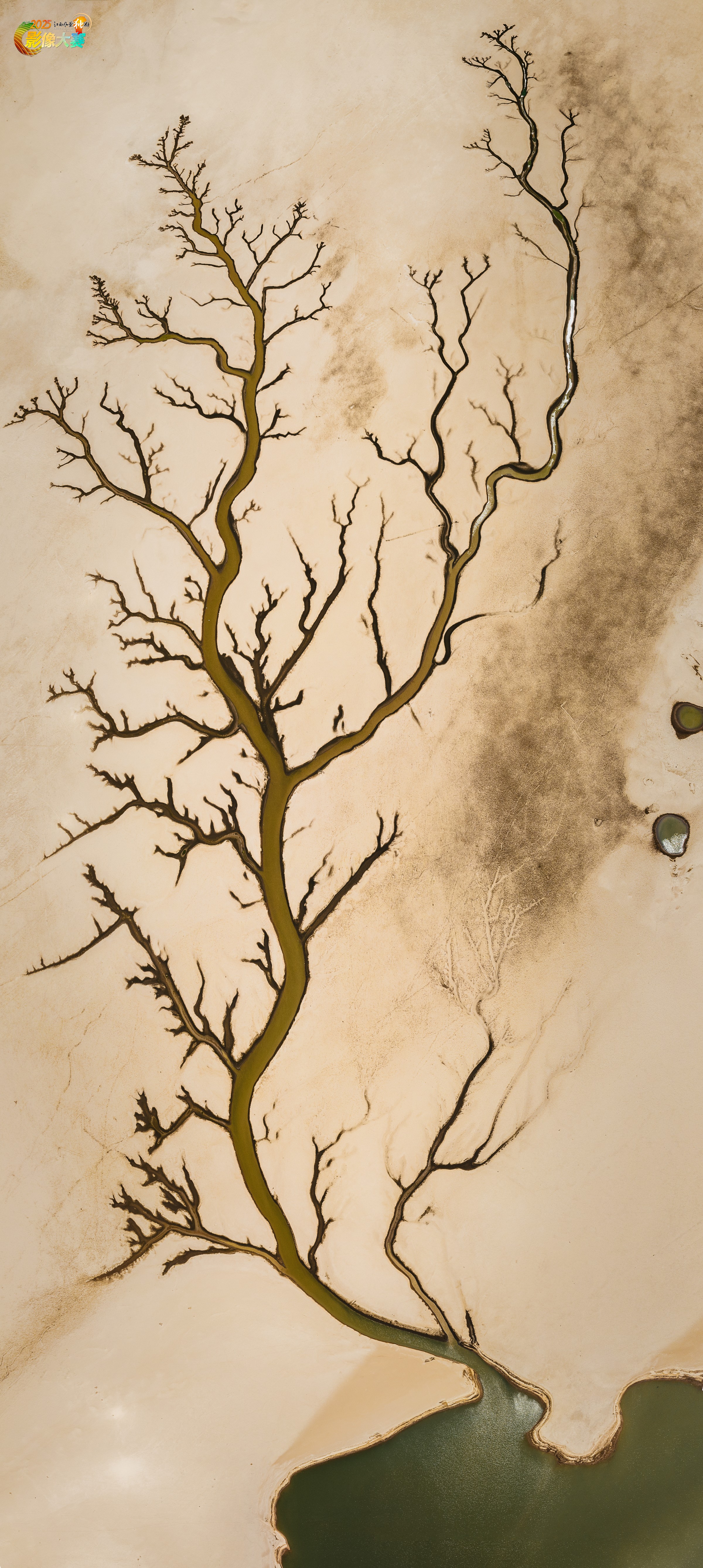 作品记录了鄱阳湖在特定干旱时期,于湖床上形成的独特自然地貌——“大地之树”景观。这是由于水位下降后,原先被湖水覆盖的河道沟壑在滩涂上裸露出来,经风力、水流长期作用形成的自然肌理。 航拍俯瞰视角将其脉络清晰地呈现出来,宛如一棵枝繁叶茂的巨树。此影像不仅具有强烈的视觉艺术感,也为研究湖泊水文、湿地生态演变提供了直观的视觉资料,是自然力量与地质奇观的珍贵写照。