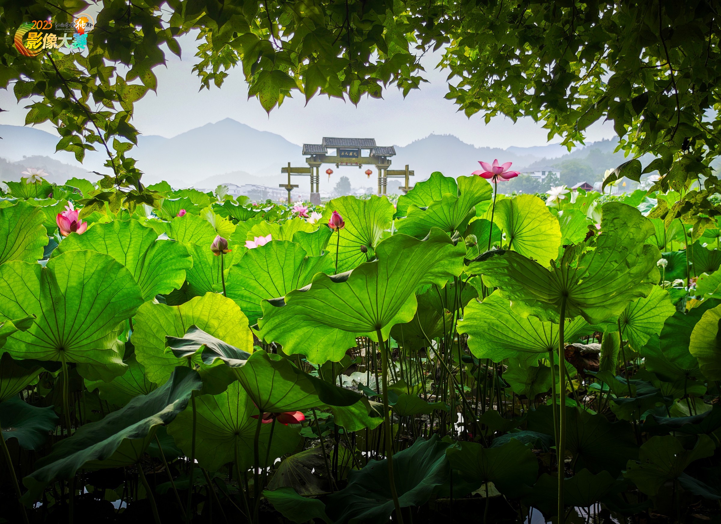 构图用枝叶当画框,把荷田、牌坊、远山裱成古典长卷。色彩是荷叶的鲜绿、荷花的粉艳,在远山的淡墨里晕开,像宋画里抠出来的配色。