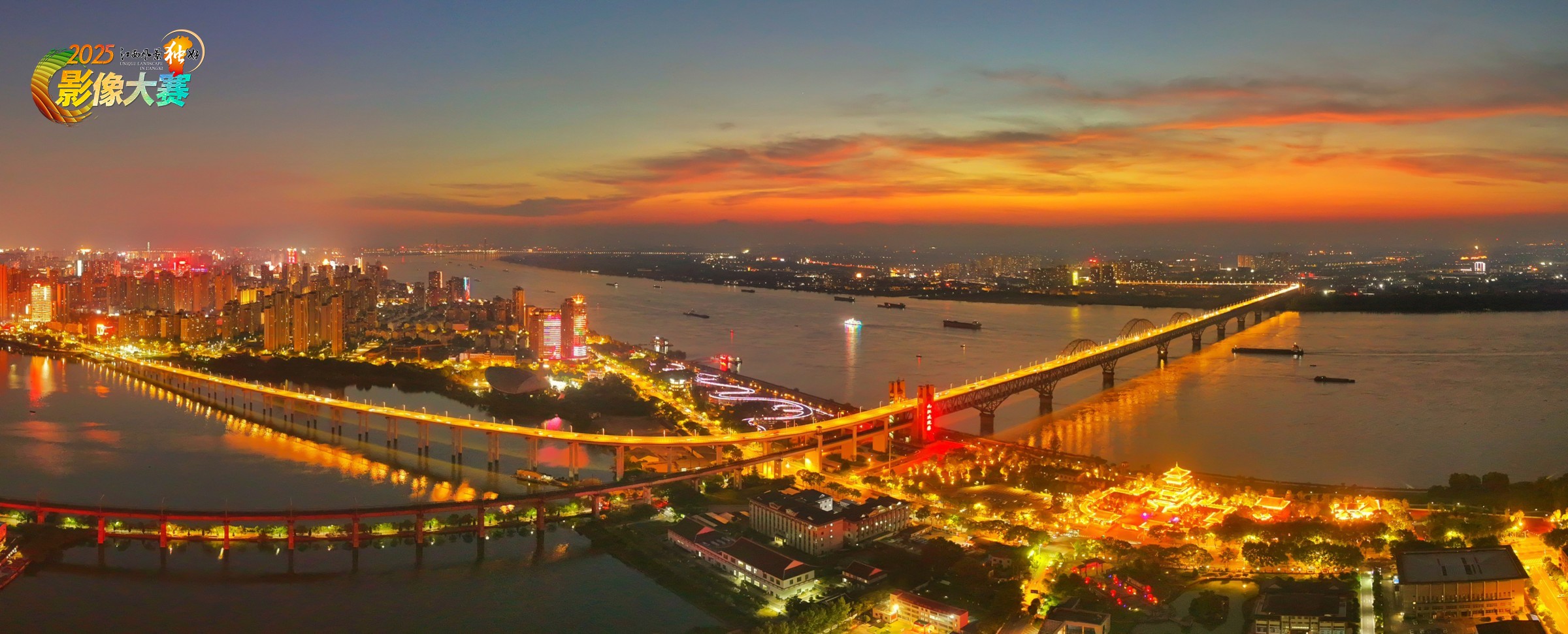 夕阳西下,九江长江大桥的及长江文化公园一带灯火阑珊,好一派祥和之景。