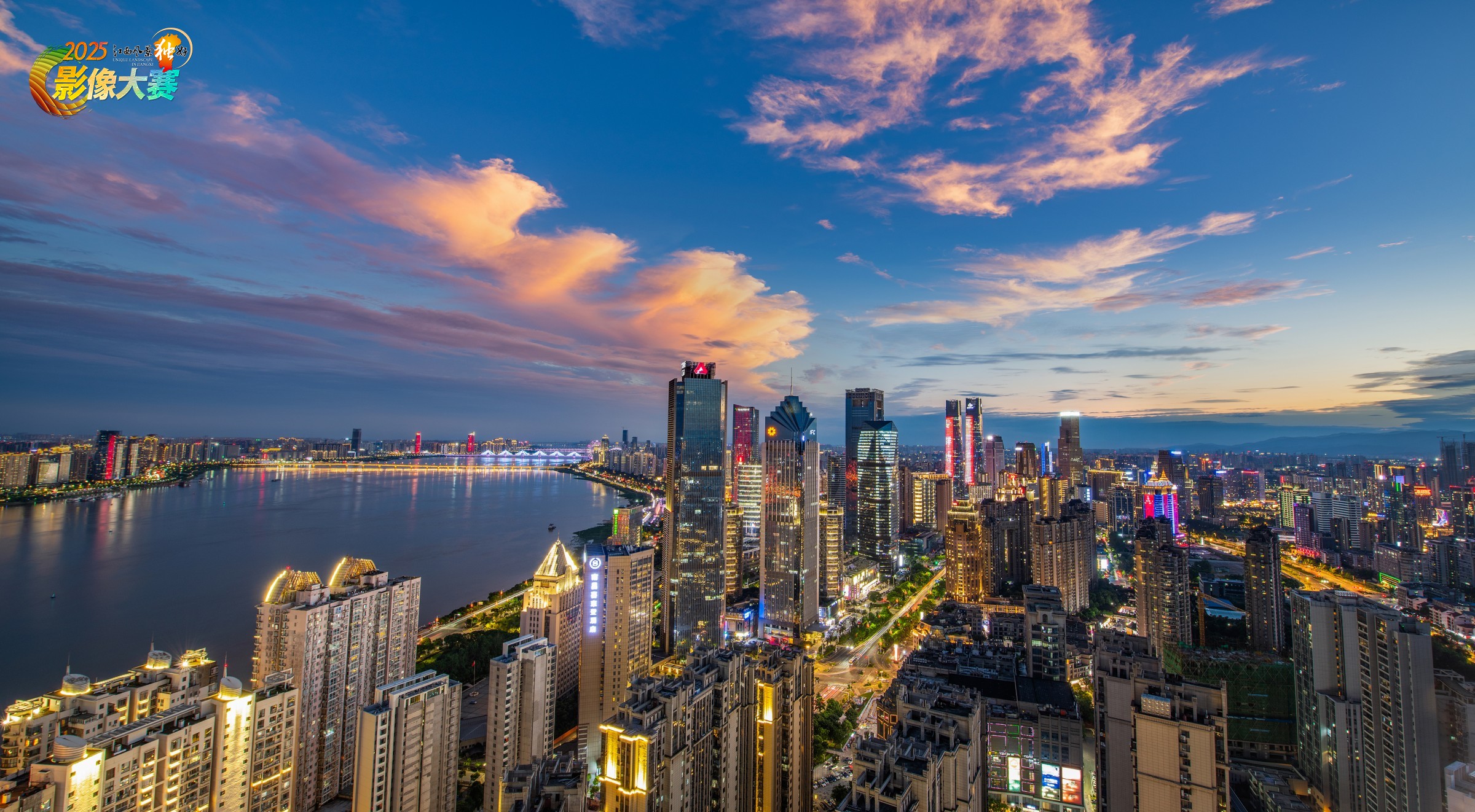 相机尼康D610拍摄,镜头24-85mm,拍摄于2023年6月26日傍晚19点左右,赣江似将丝带样的晚霞“绣”进楼群。